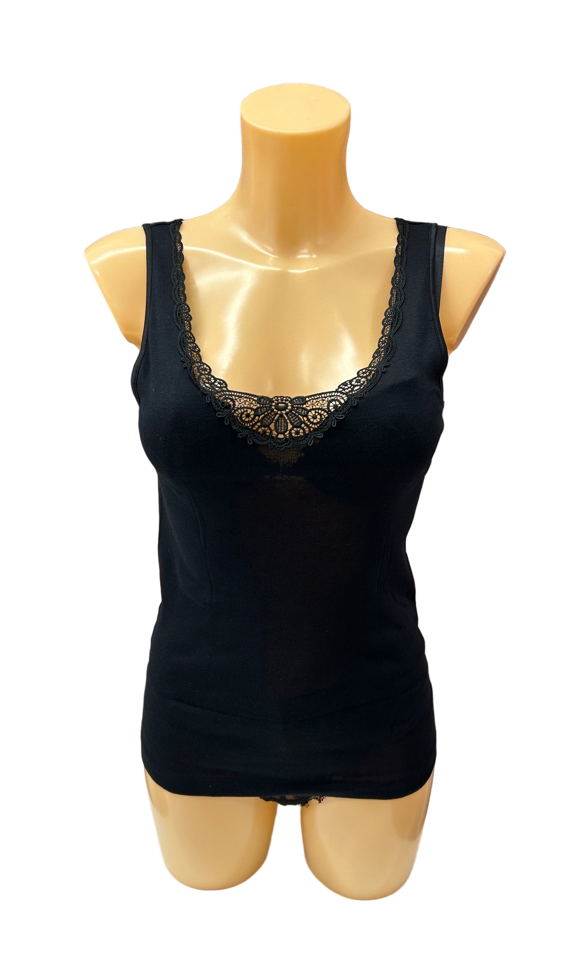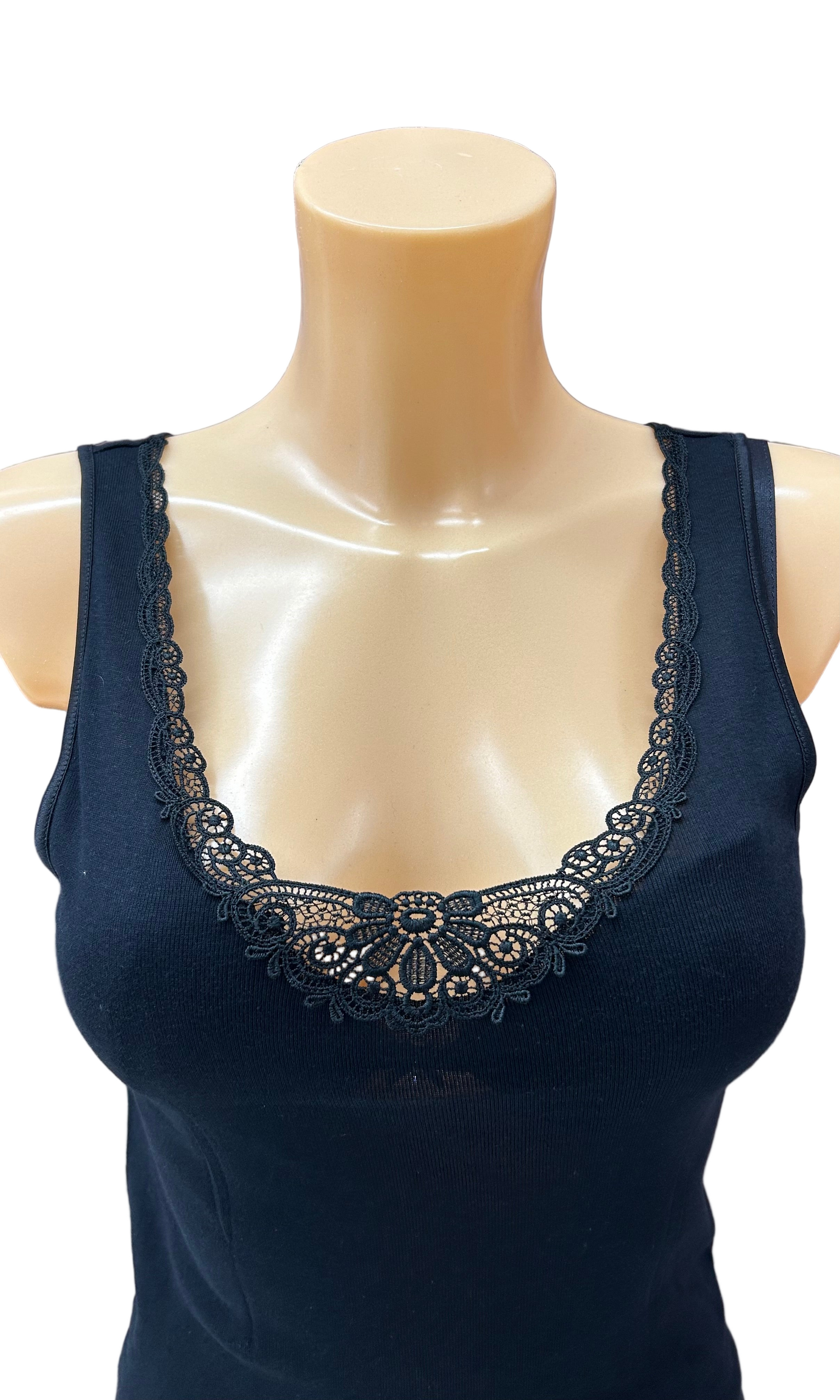 98321 BISBIGLI: Canottiera spalla larga con lavorazione in pizzo macrame’ cu centro davanti scollo in 100% cotone mako’. Disponibile in due varianti colore : NERO e BIANCO OTTICO.