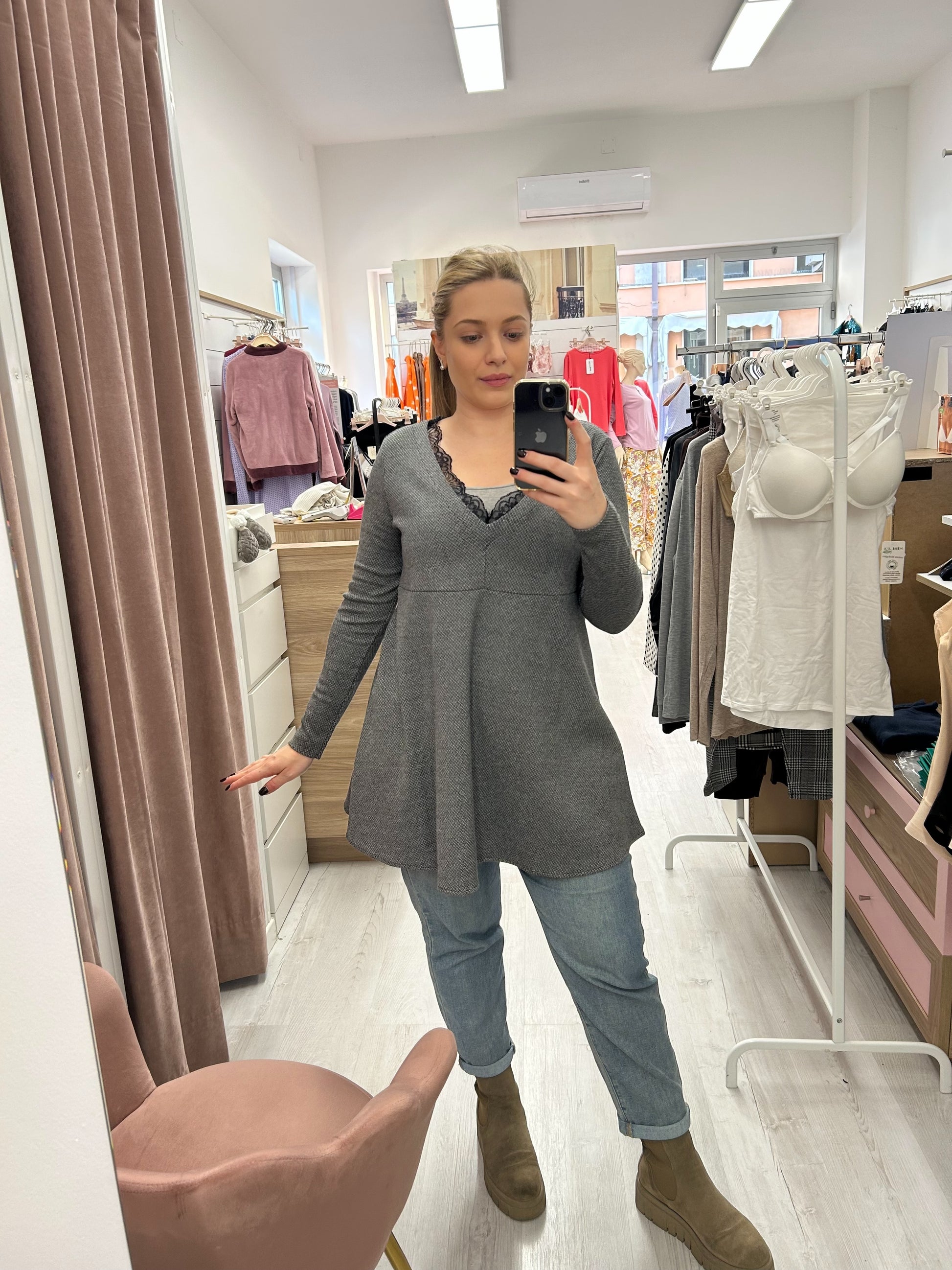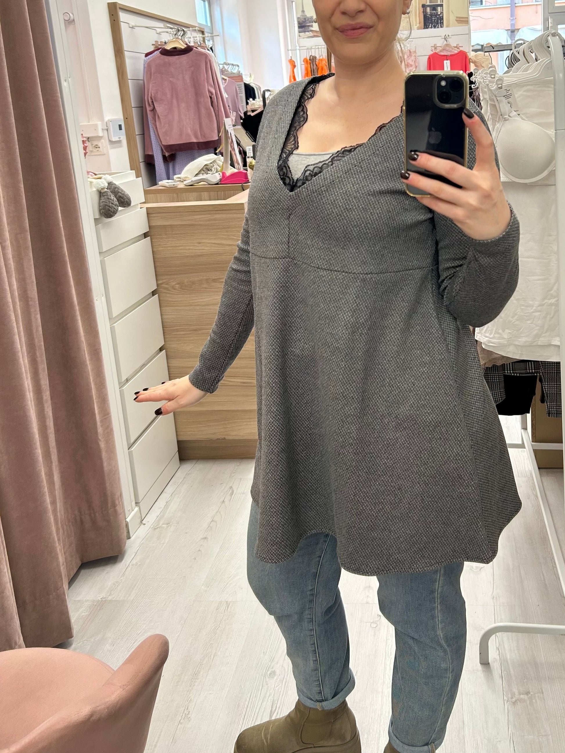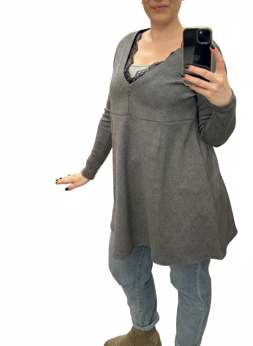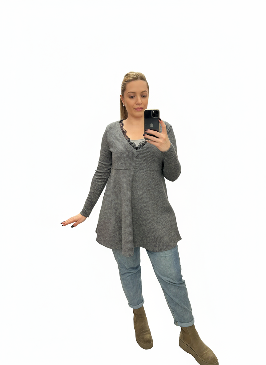 77647 BISBIGLI: Abito, versatile da indossare anche come maxi maglia, scollo V con pizzo e manica lunga. Linea svasatura linea A, fantasia rombo sale e pepe. Composizione: cotone,poliestere, Elastan. Disponibile variante colore unica.