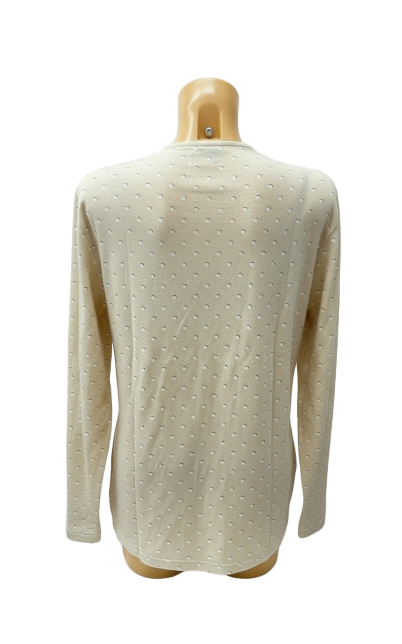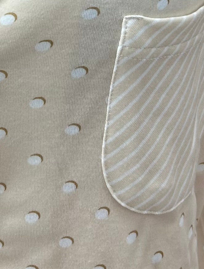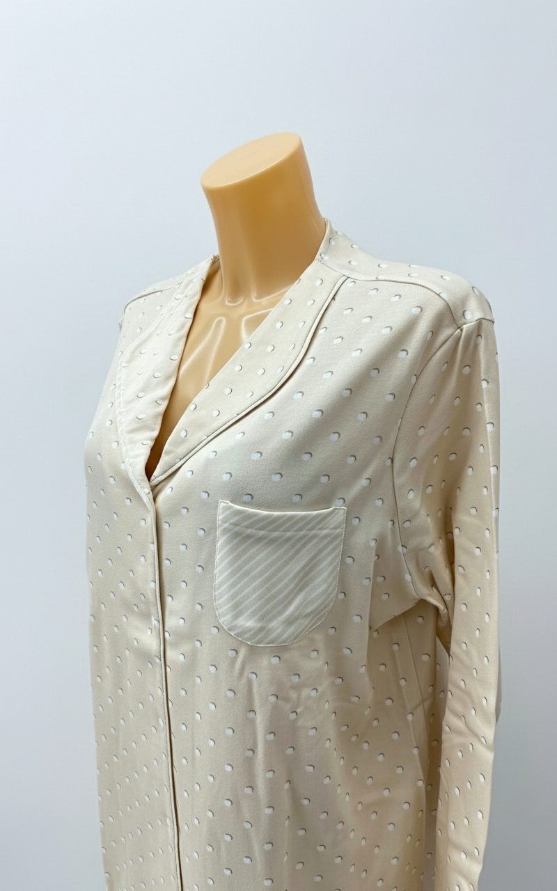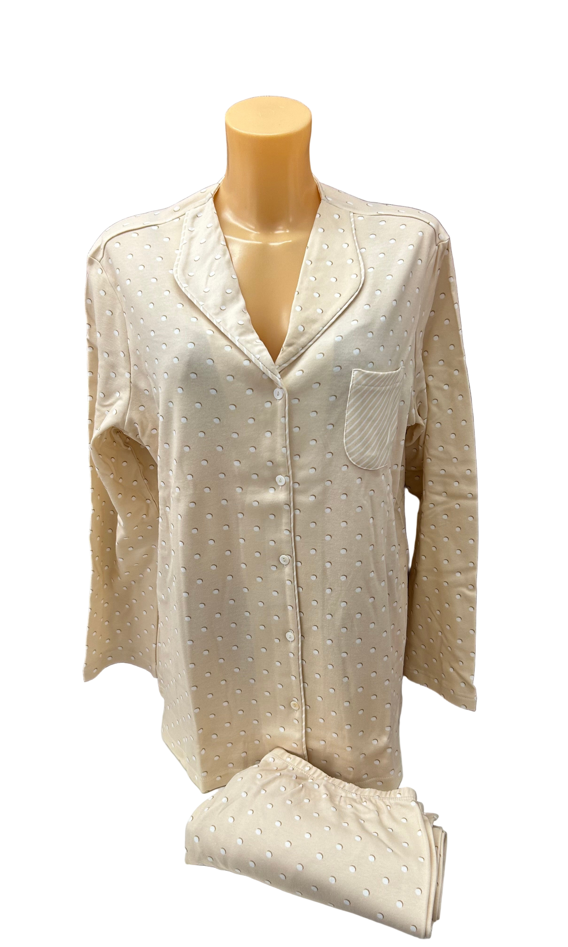 BP292955 BISBIGLI: pigiama aperto a camicia collo rever con manica lunga e pantalone lungo. Stampa allover fantasia pois giacca e pantalone. Realizzato in morbido e caldo cotone, il pigiama aperto a camicia BISBIGLI è perfetto per le notti più fredde. La fantasia a pois in stampa allover e il collo rever rendono questo pigiama elegante e versatile, adatto a ogni occasione. Dormi comodo e alla moda con BISBIGLI. Disponibile variante colore unica: 0133PANNA/CORDA.