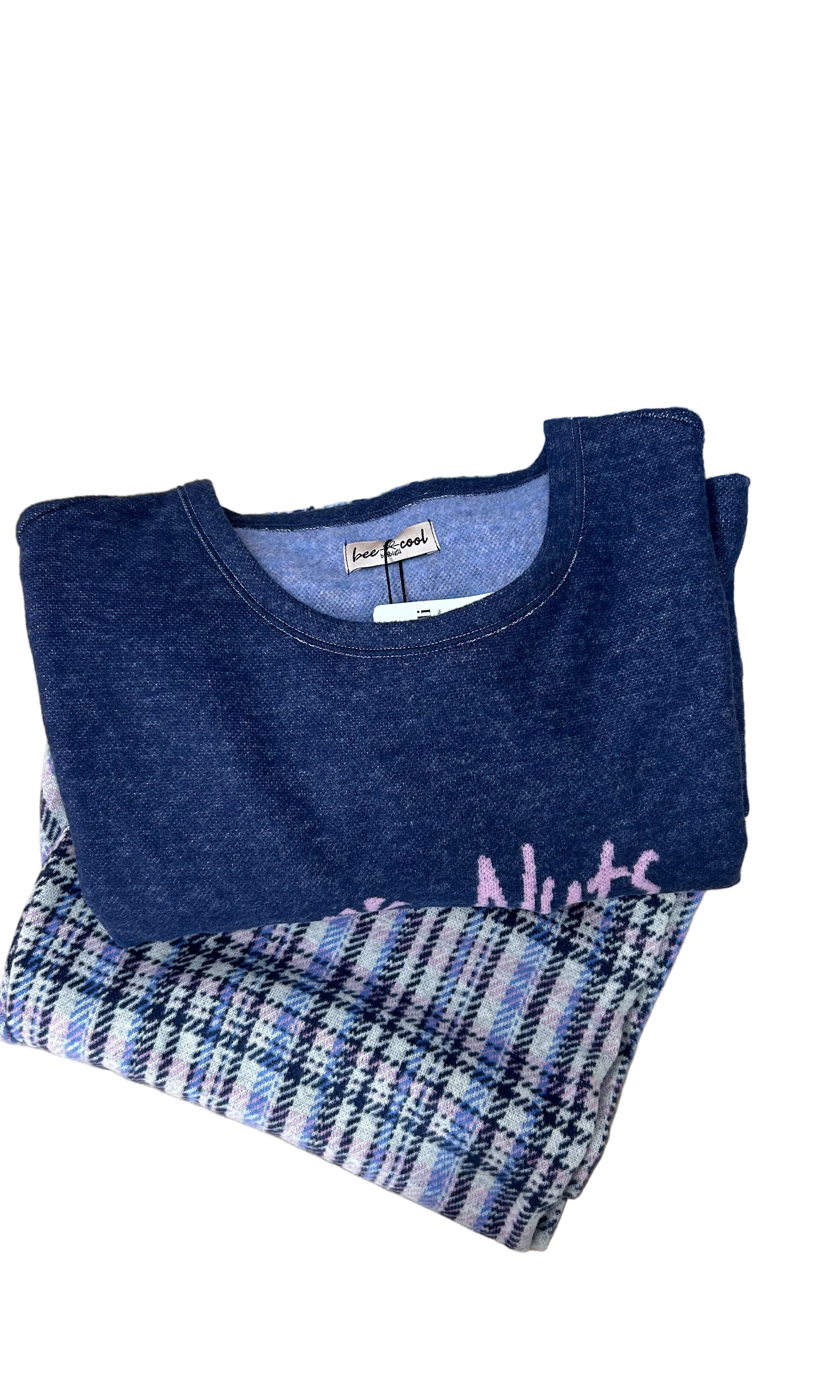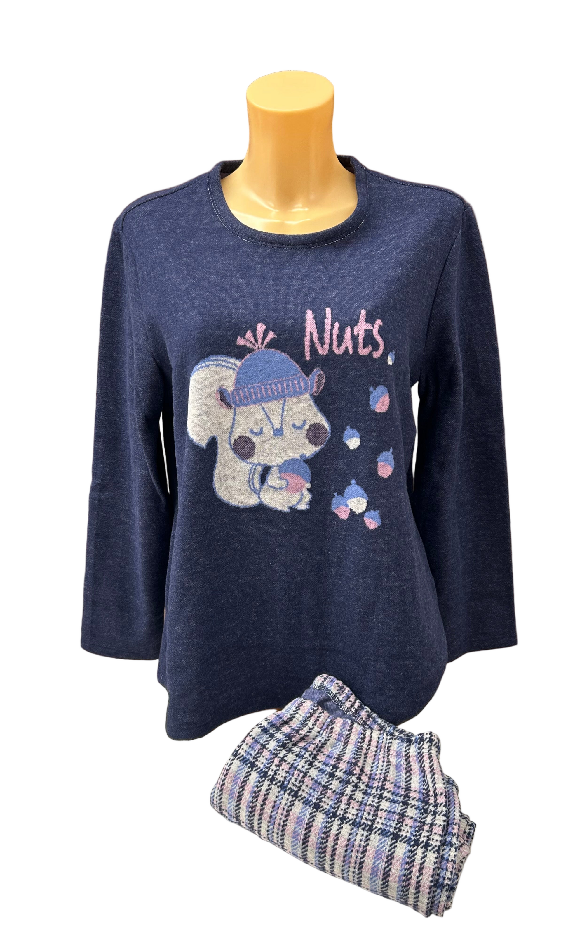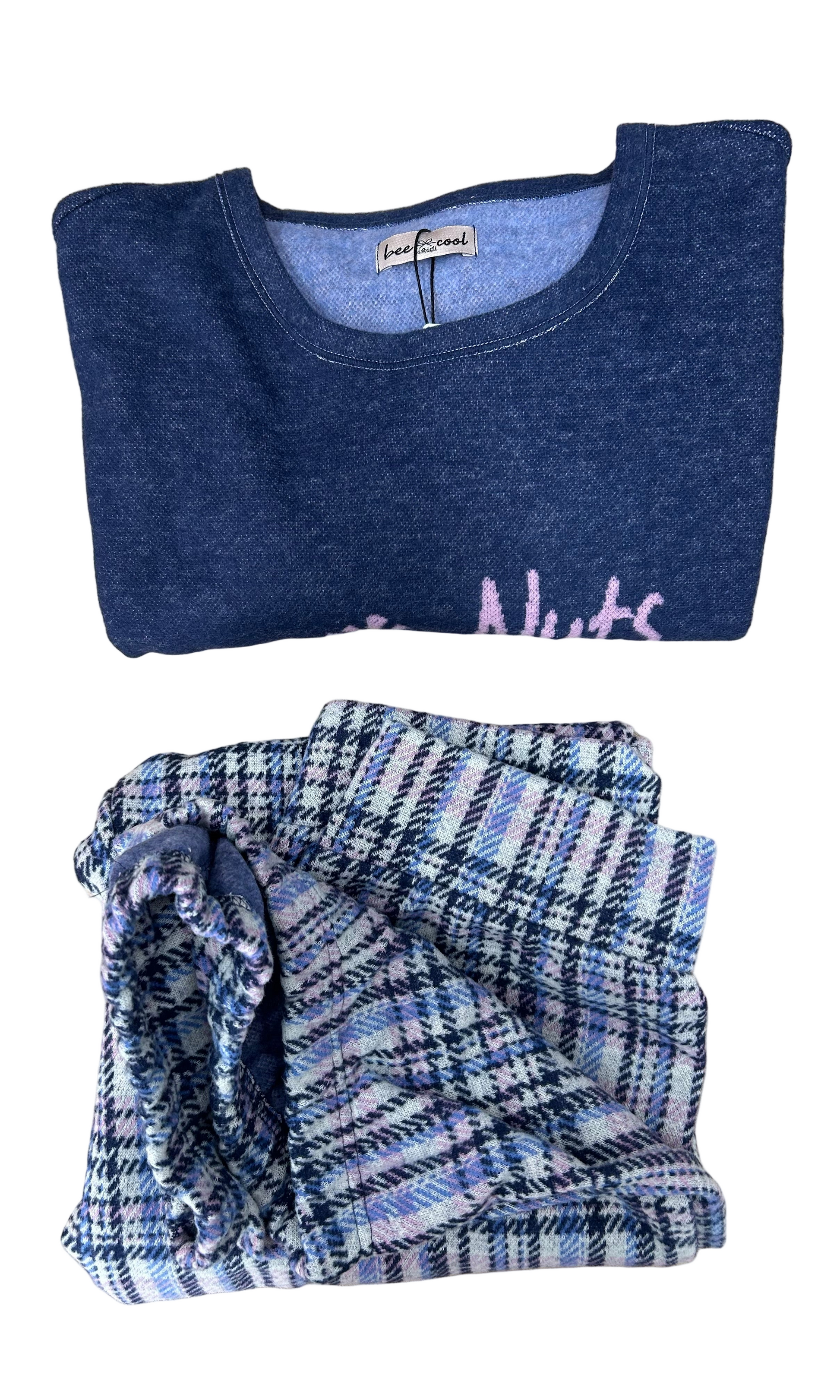 BP377850 BISBIGLI : pigiama girocollo serafino manica lunga, pantalone lungo. Realizzato in 100% pile rasato con percentuale in mischia di cotone. Stampa allover in check-quadro nel pantalone a contrasto con la maglia in tinta unita e stampa fantasia. Il pigiama in pile rasato BISBIGLI è il tuo nuovo compagno per la notte! Realizzato in morbido pile, ti garantirà un comfort ineguagliabile. Il pantalone a quadri scozzese dona un tocco di stile al design semplice ma elegante del pigiama, perfetto per le fredde notti d'inverno. Dormi sonni tranquilli e rilassati con BISBIGLI! Disponibile variante colore unica: 02BLU.