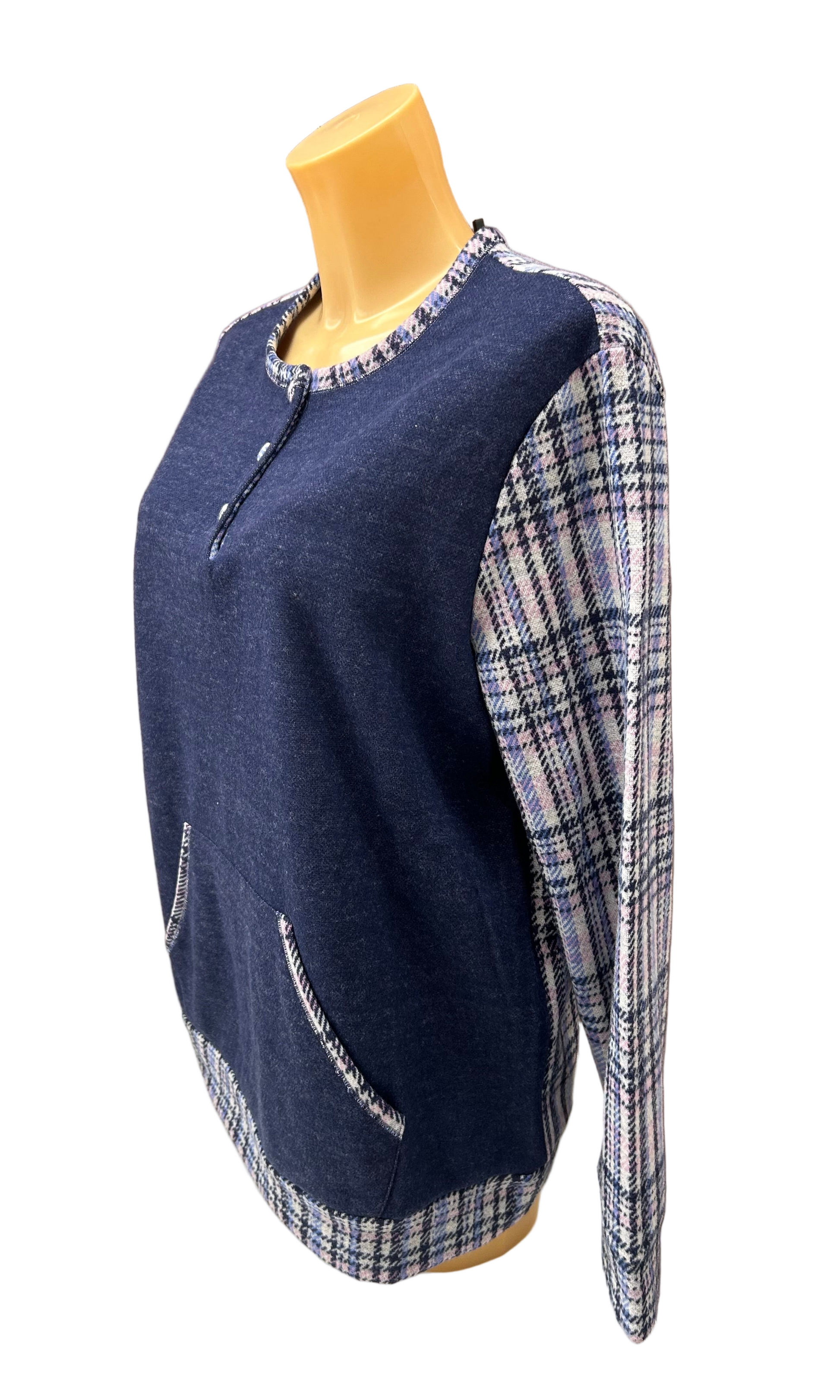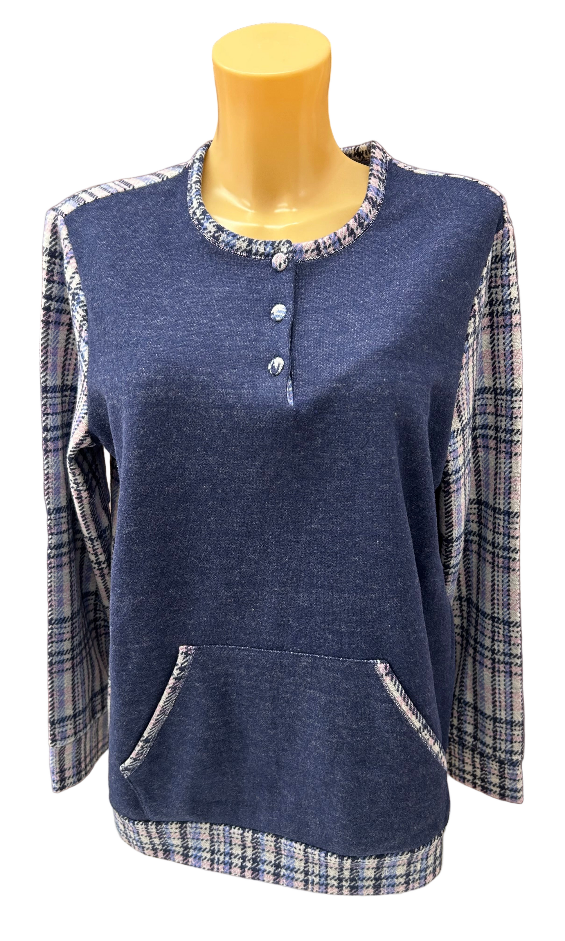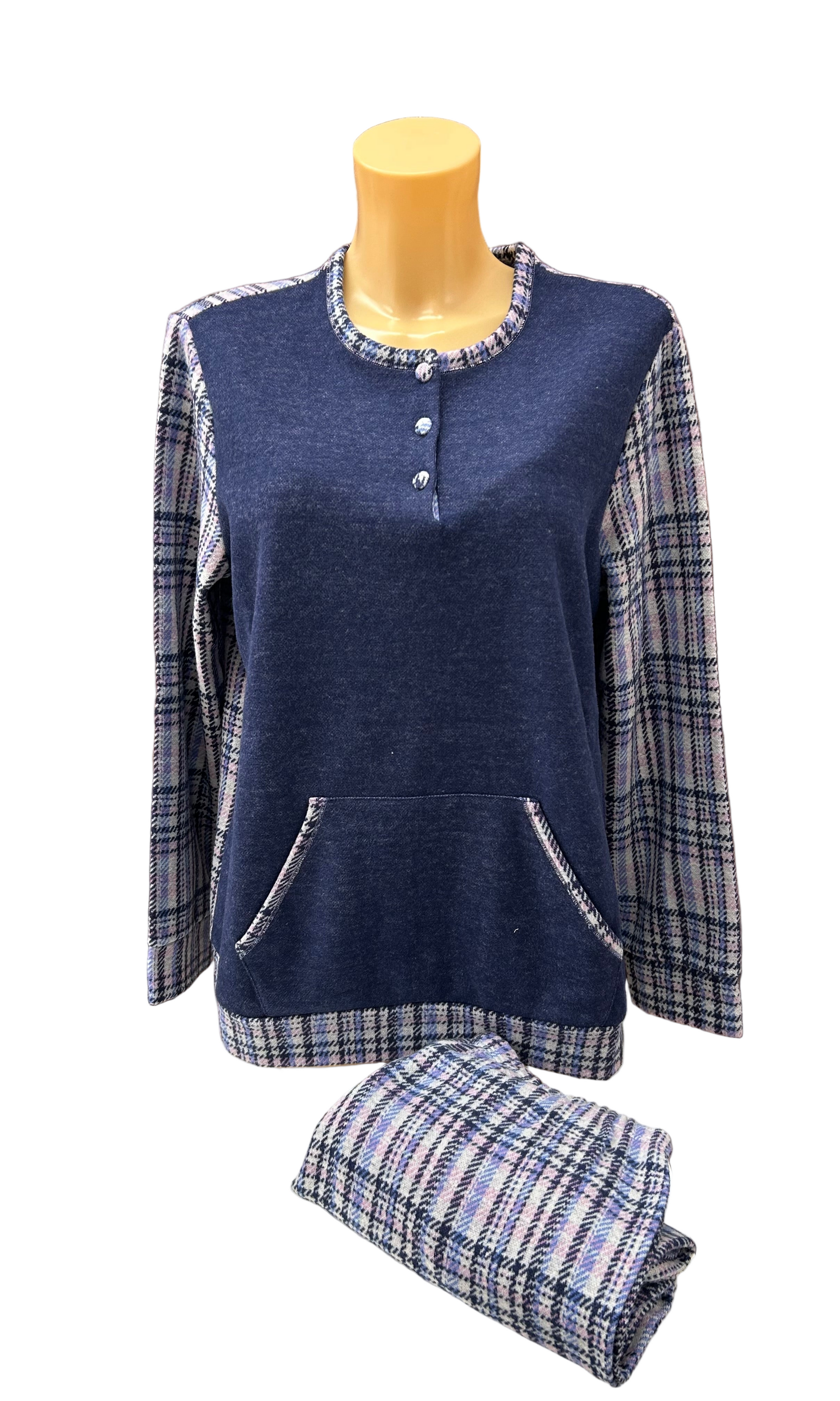 BP377851 BISBIGLI: pigiama girocollo serafino, manica lunga pantalone lungo. Variante check - quadro: centro dietro capo, parte alta, manica, rifiniture e bordatura tascone americano centrale.Realizzato in pile rasato con percentuale in mischia di cotone, questo pigiama è perfetto per le notti d'inverno grazie al suo design scozzese a scacchi. Lasciati avvolgere dal calore e dal comfort, per un sonno ristoratore e rigenerante. Questo capo unisce lo stile dello scozzese con la funzionalità di un tascone, per un mix perfetto di moda e praticità. Disponibile variante colore unica: 02BLU.