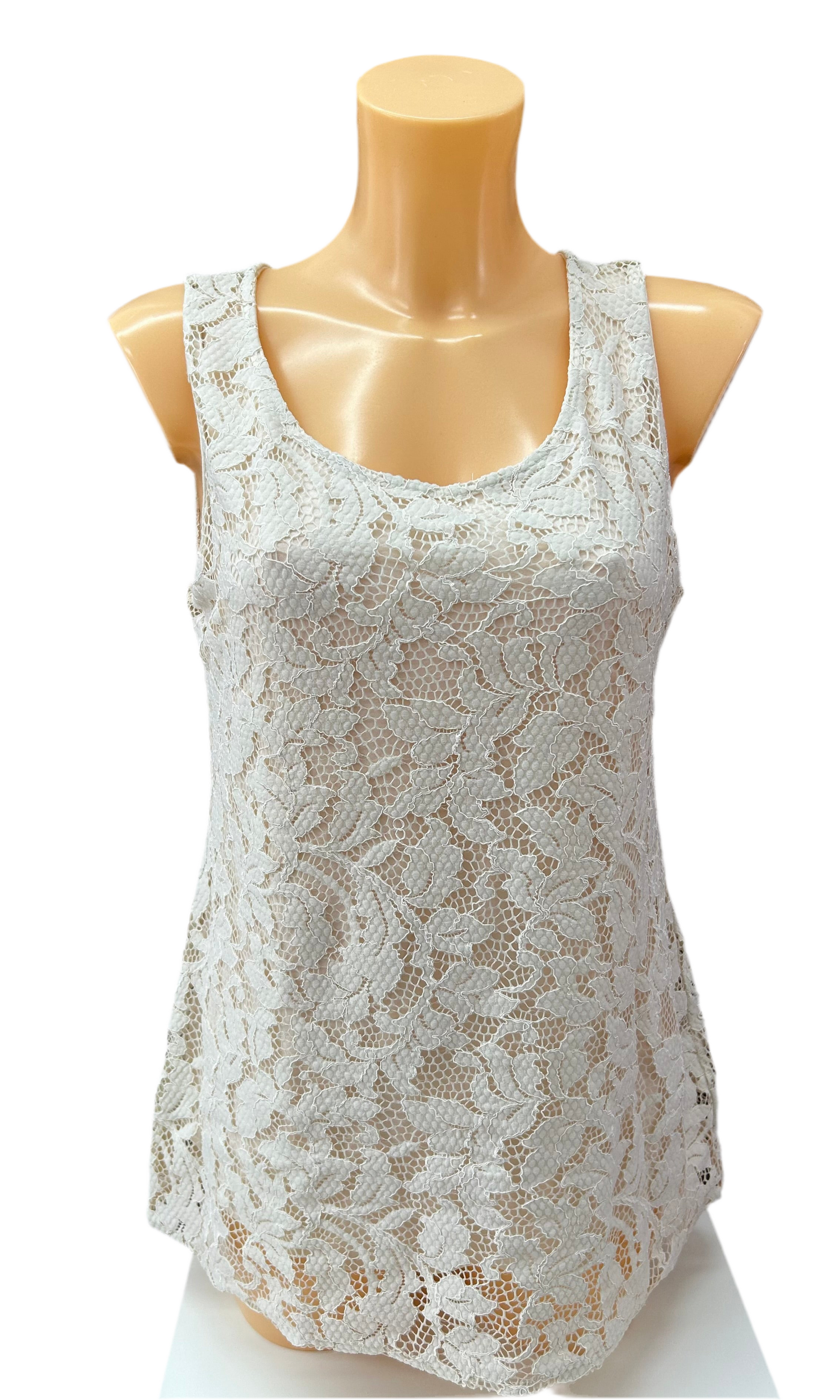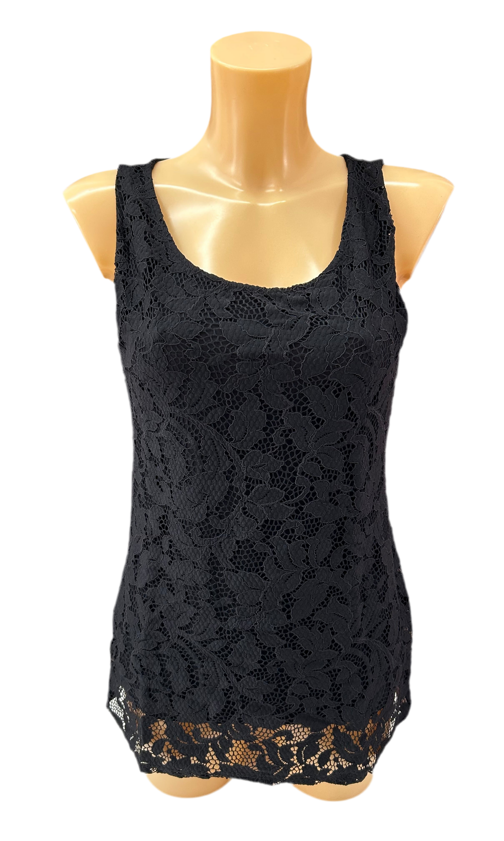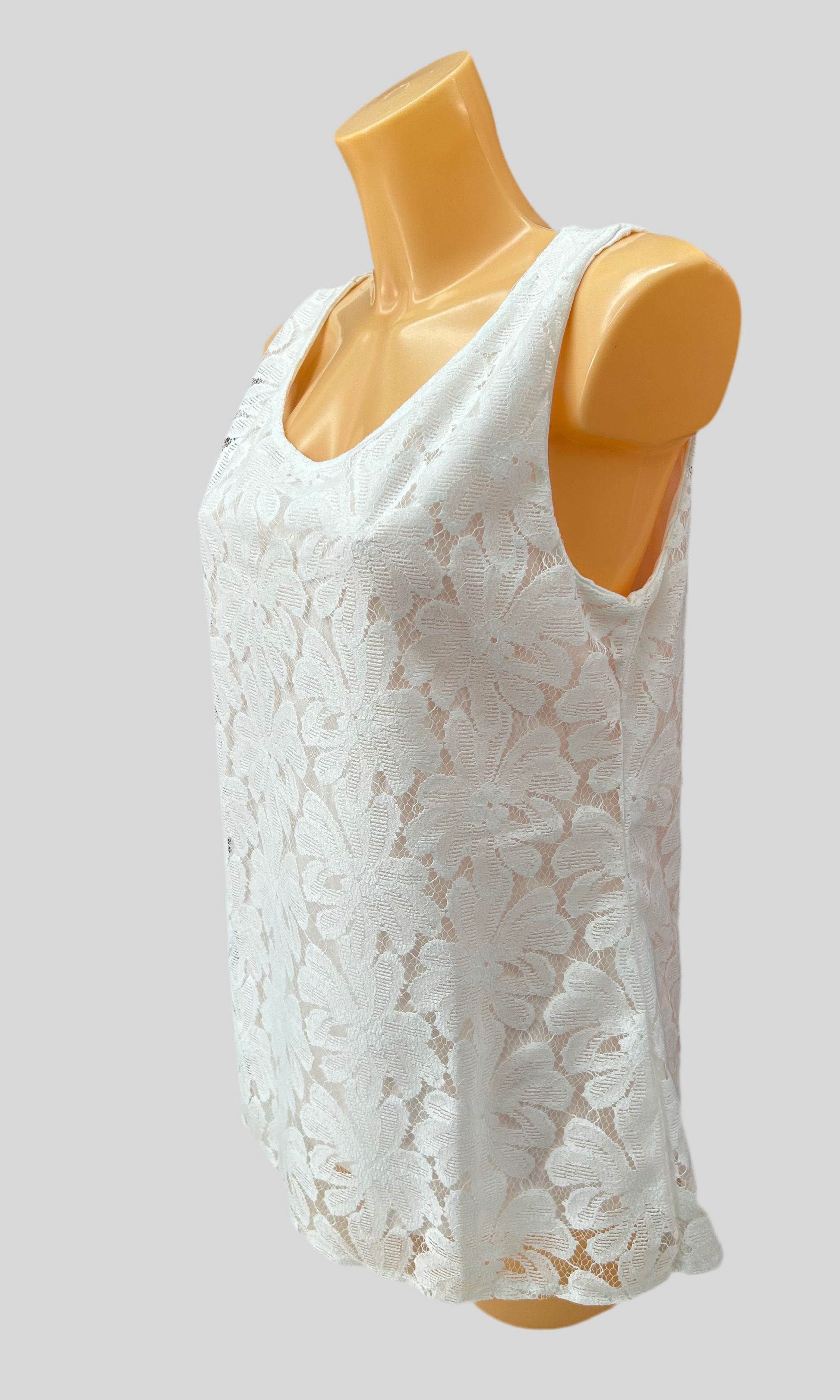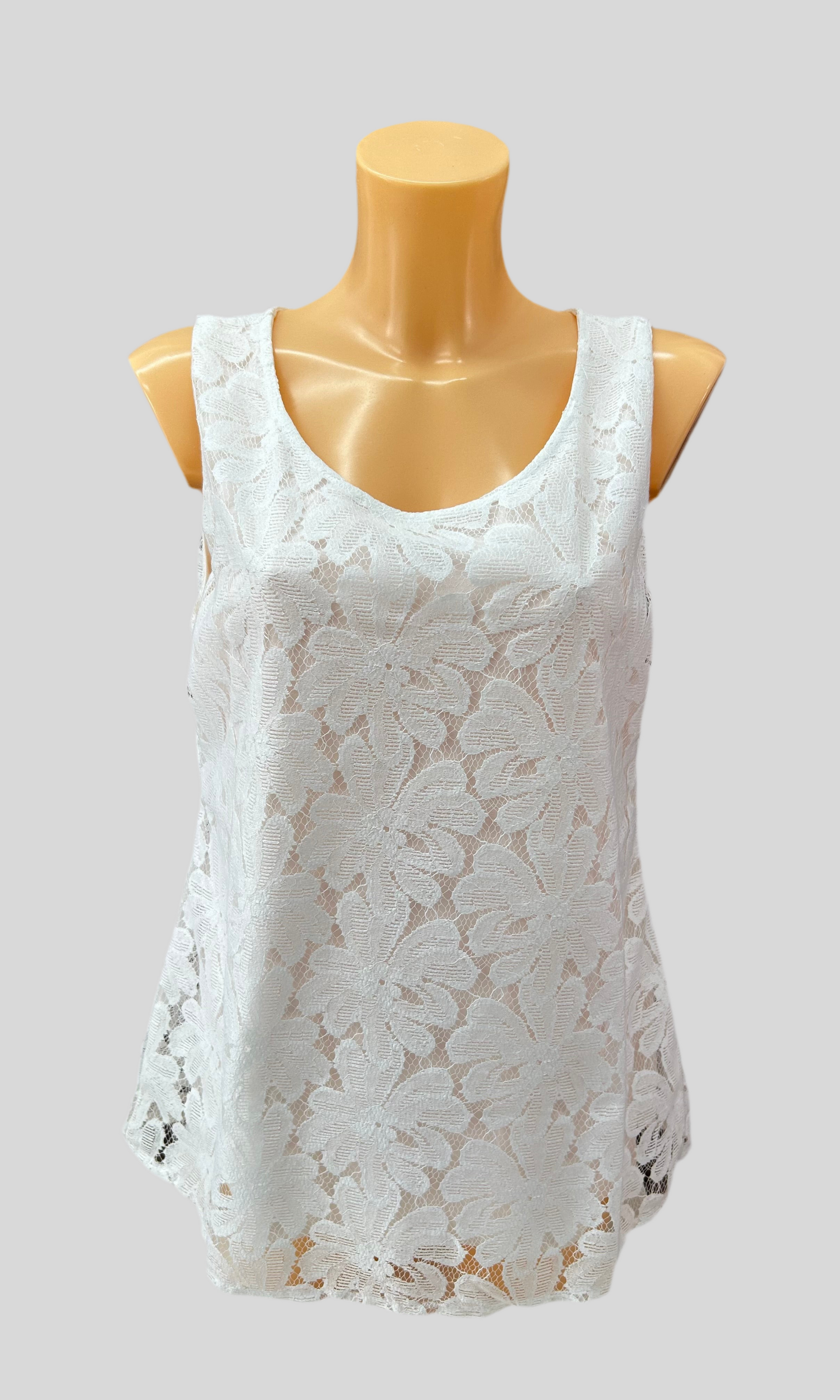004093099 BISBIGLI : Sottogiacca girocollo, canotta spalla larga a due strati : esterno in pizzo ricamato 100% poliestere e interno fodera in tinta unita taglio laser su fondo 92%viscosa - 8% Elastan. Disponibile in 4 varianti colore : BIANCO OTTICO, NERO, GLICINE, PANNA.