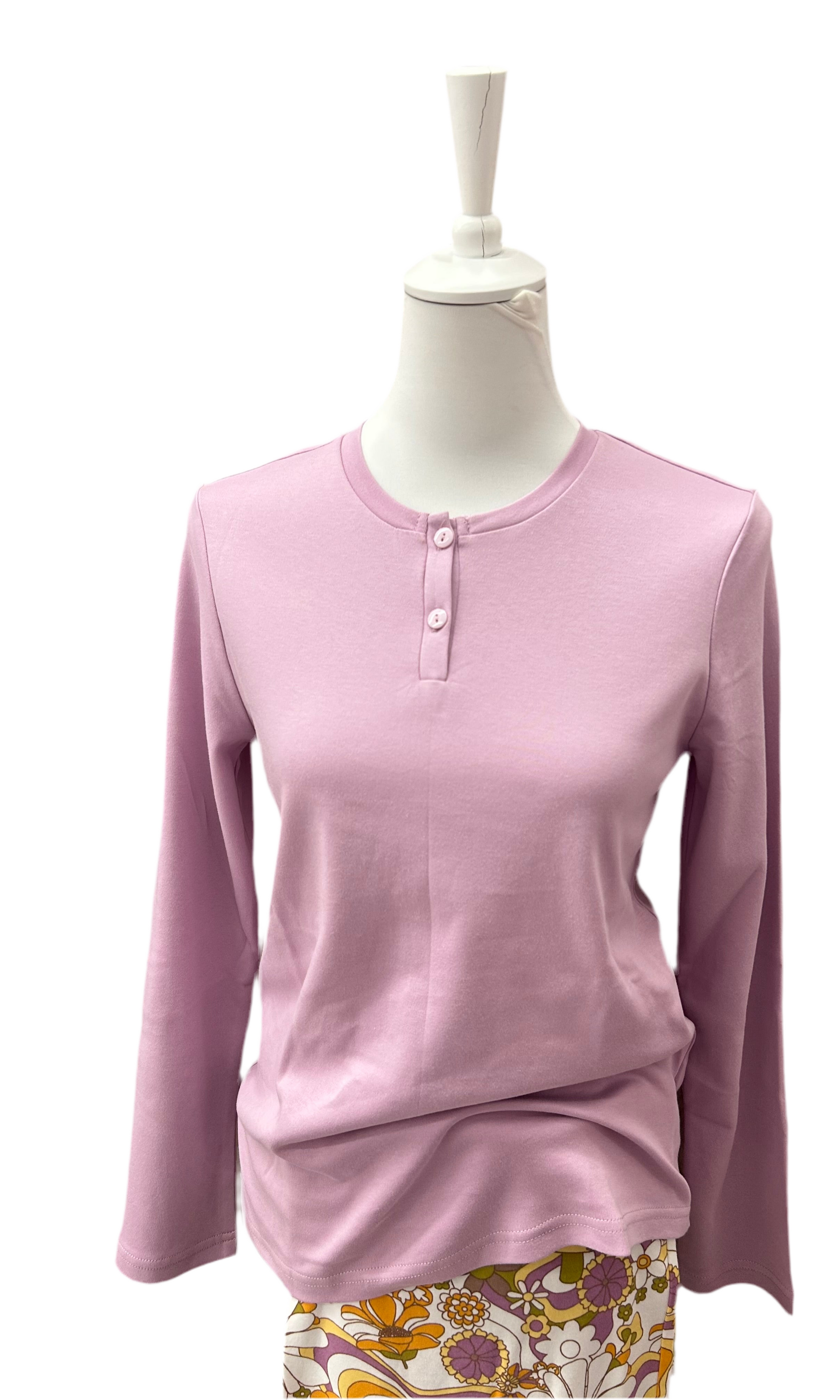 BQ892005 BRILLIAMO: Pigiama girocollo serafino pantalone lungo manica lunga, tinta unita nella parte alta indossata e pantalone stile zampa, stampa fantasia floreale 100%cotone. Variante colore unica 01AURORA/PANNA. Disponibilità variante colore all over modello aperto a camicia.
