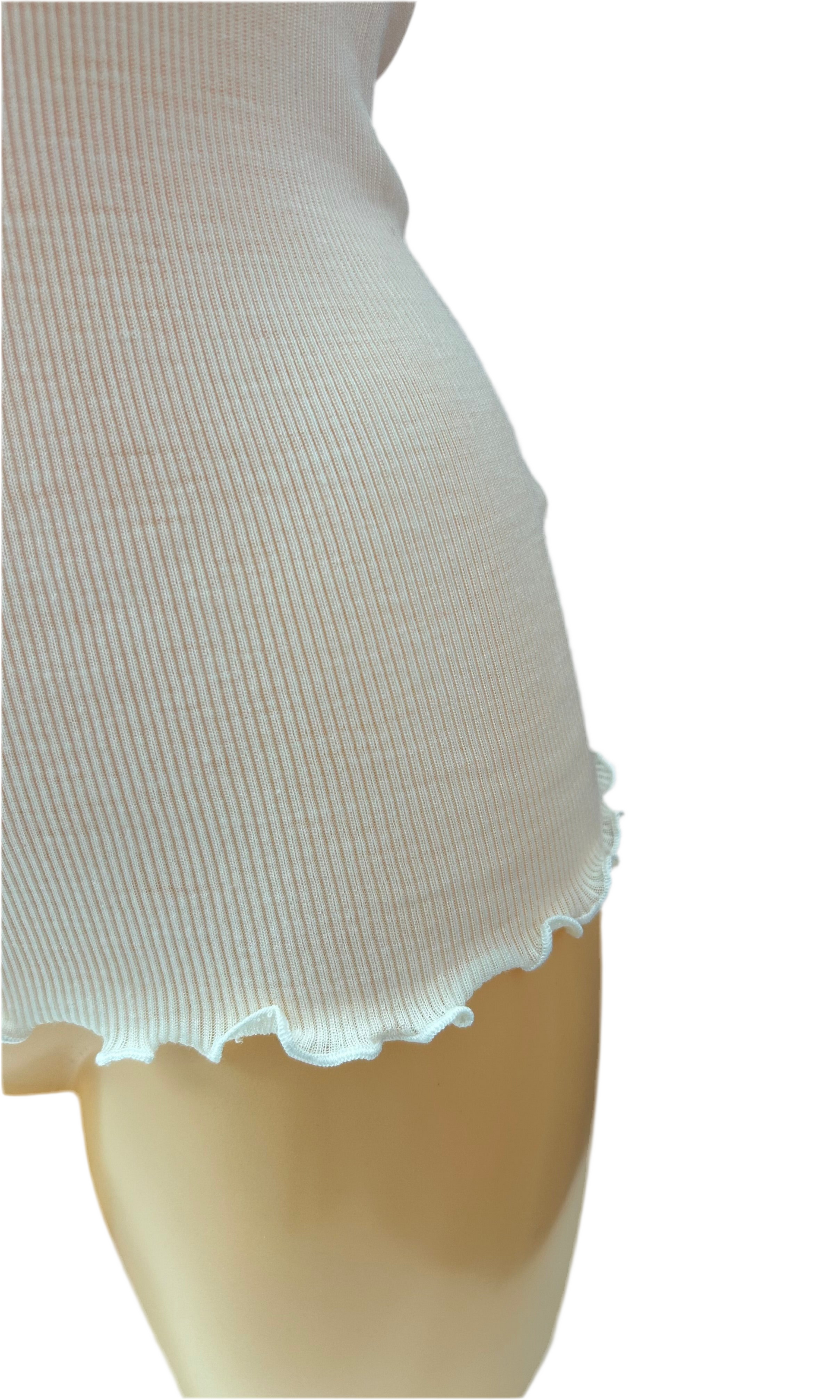 BCC53046 BISBIGLI: canotta lavorata a Costa 2x1 in lana e seta extra fine con bordatura girocollo, spalla e fondo in pizzo. Disponibile in 4 varianti colore: BIANCO LANA, CIPRIA, GRIGIO PERLA, NERO.