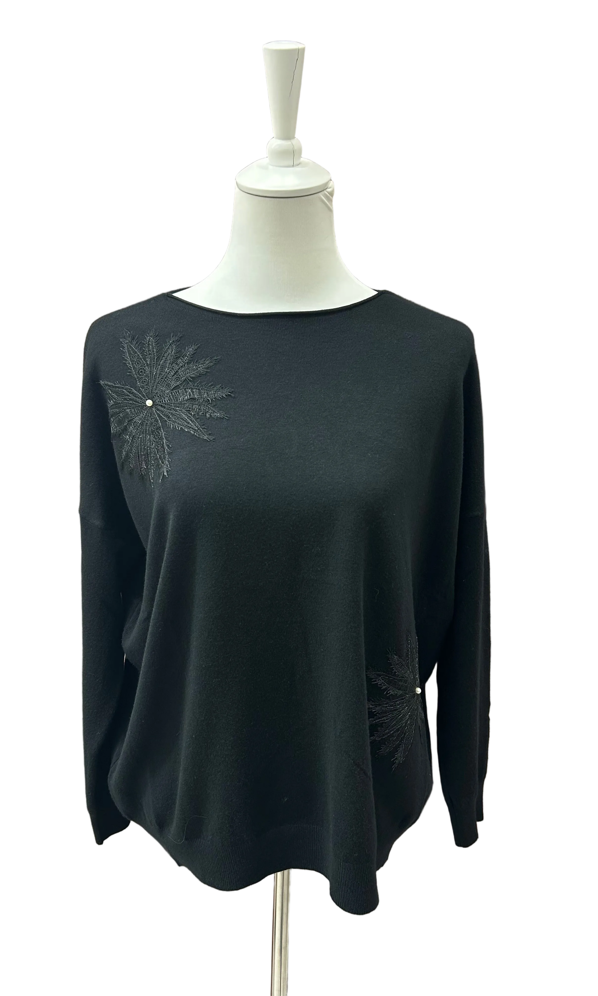 GRE369/2548 LA BOUTIQUE: Maglia scollo a barca, modello over a scatola, con applicazione di perla e ricamo floreale. MADE IN ITALY. Disponibile in due varianti colore: CASHA e NERO. TAGLIA UNICA.