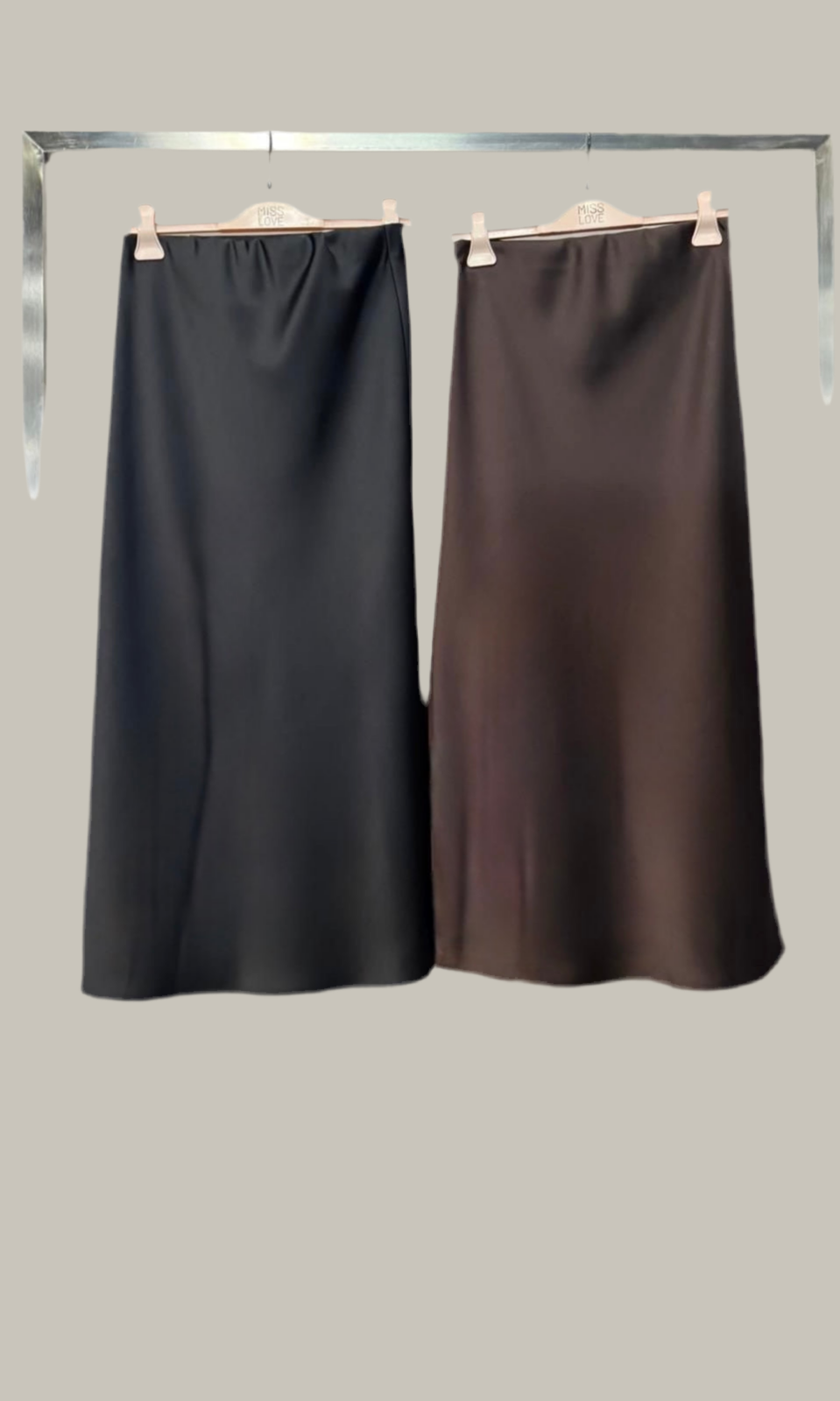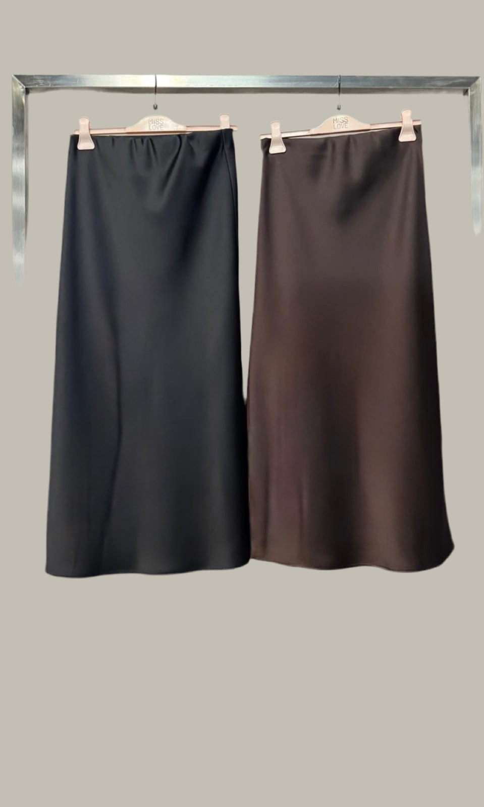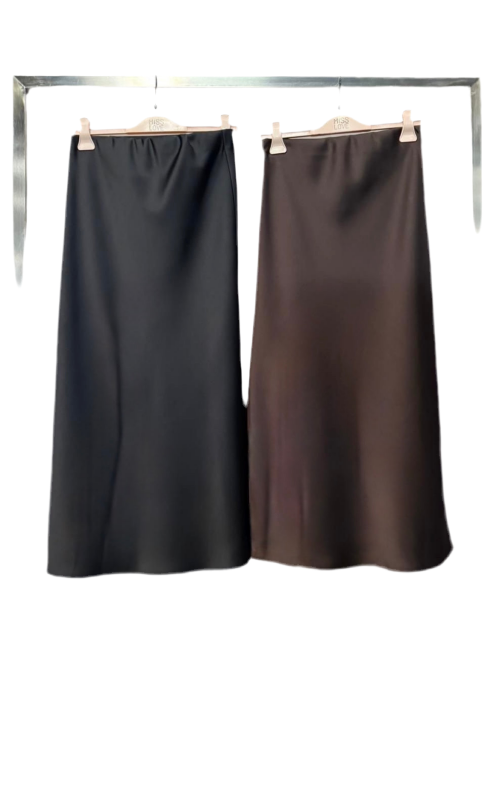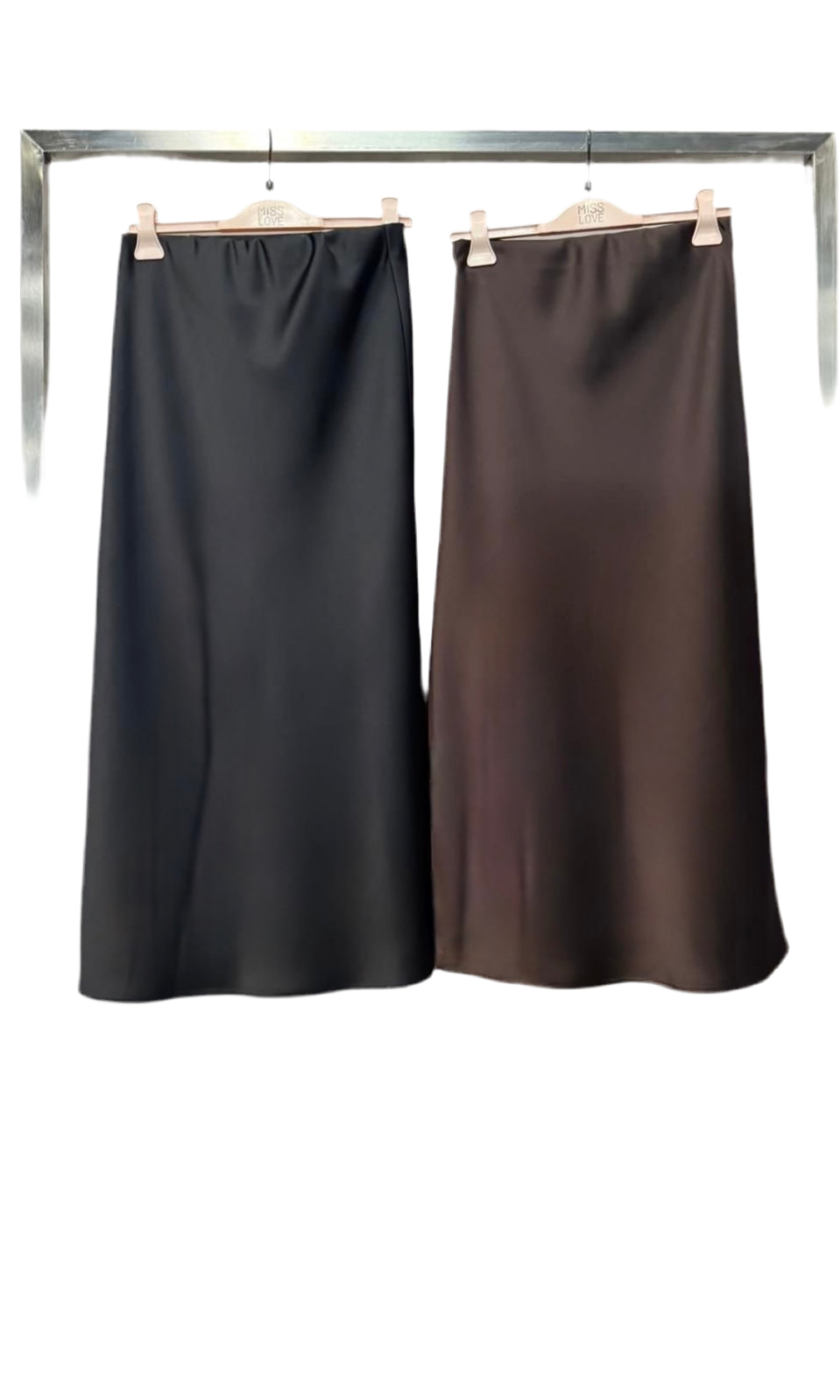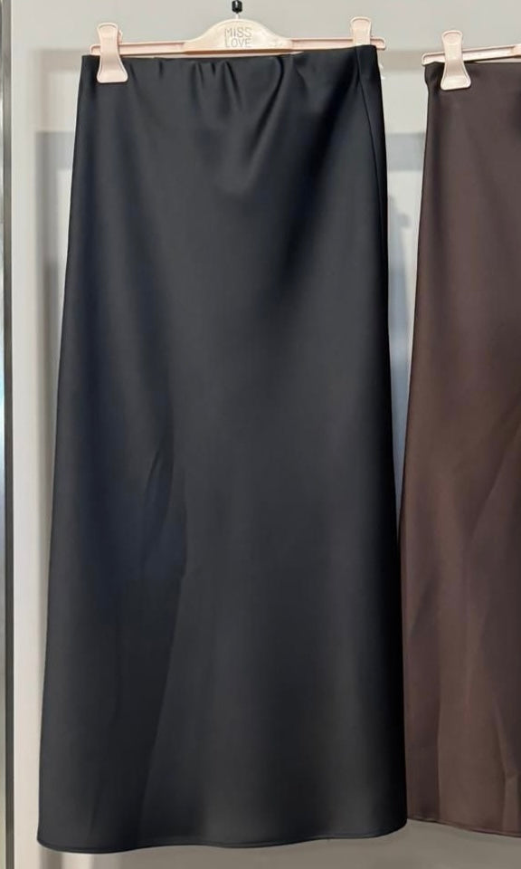 25MAG151 MISSLOVE: Gonna lunghezza midi con elastico in vita effetto raso setificato. Disponibile in 2 varianti colore: NERO e MOCHA.