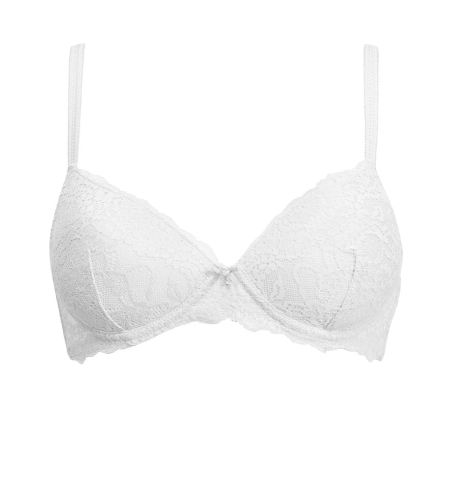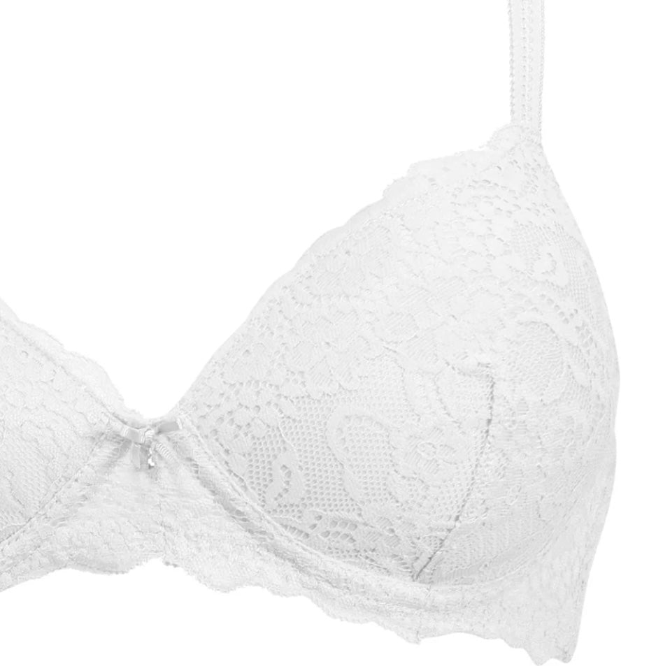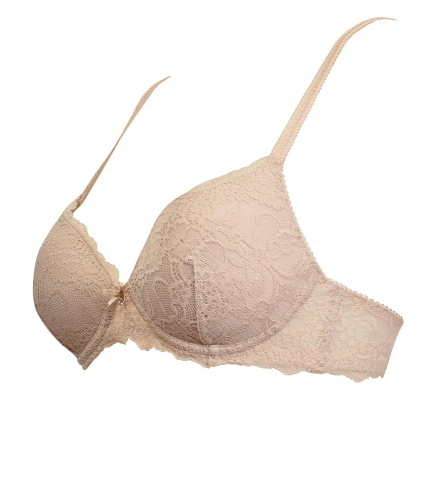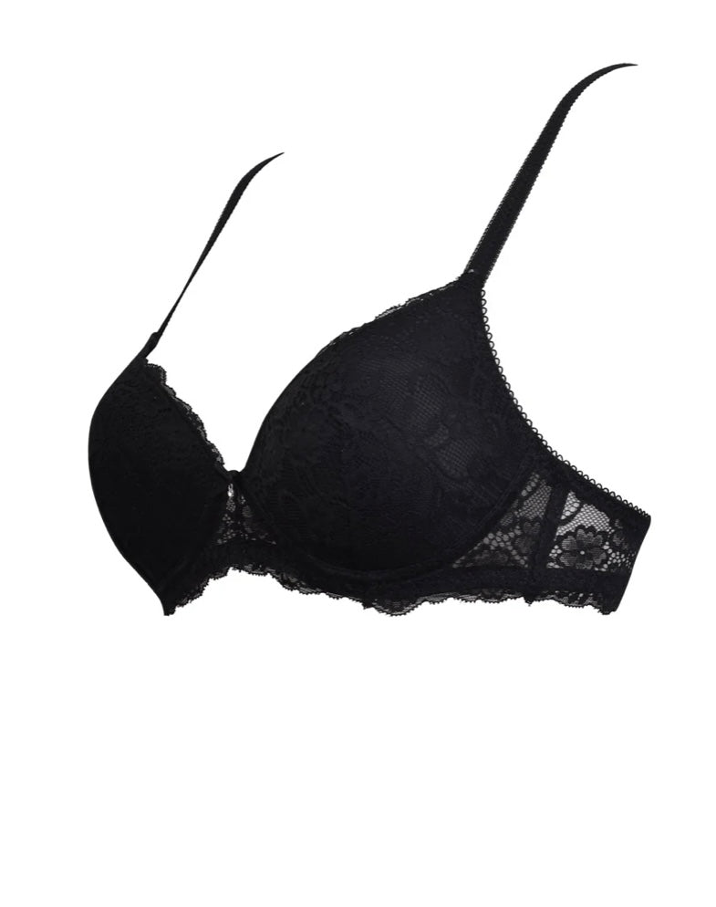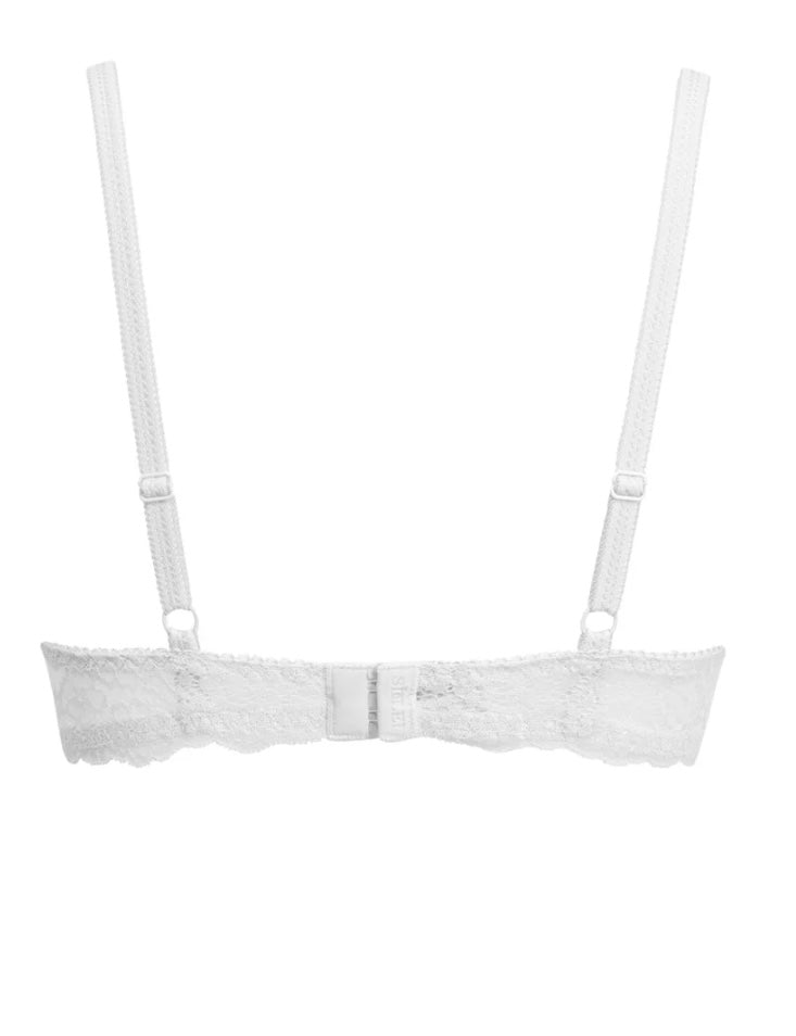 2676 SIELEI : Reggiseno con coppe graduate senza ferretto, realizzato in raffinata balza di pizzo con motivo floreale. Torace e centroseno in laize di pizzo con spalline regolabili. Dettaglio a centroseno di fiocchetto in raso con gioiello e punto luce.