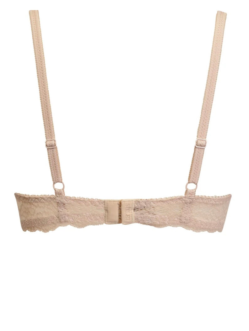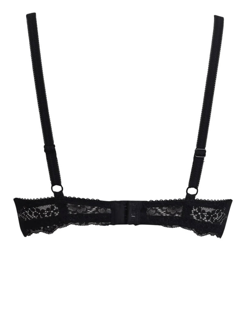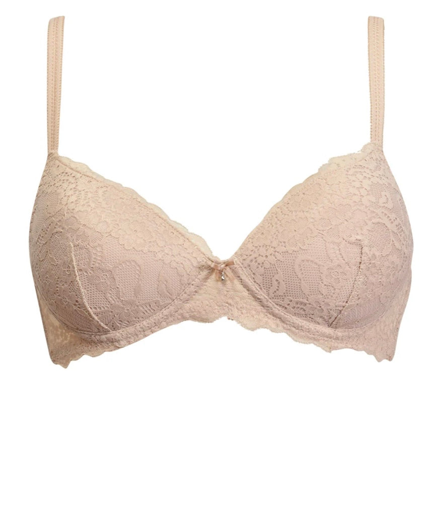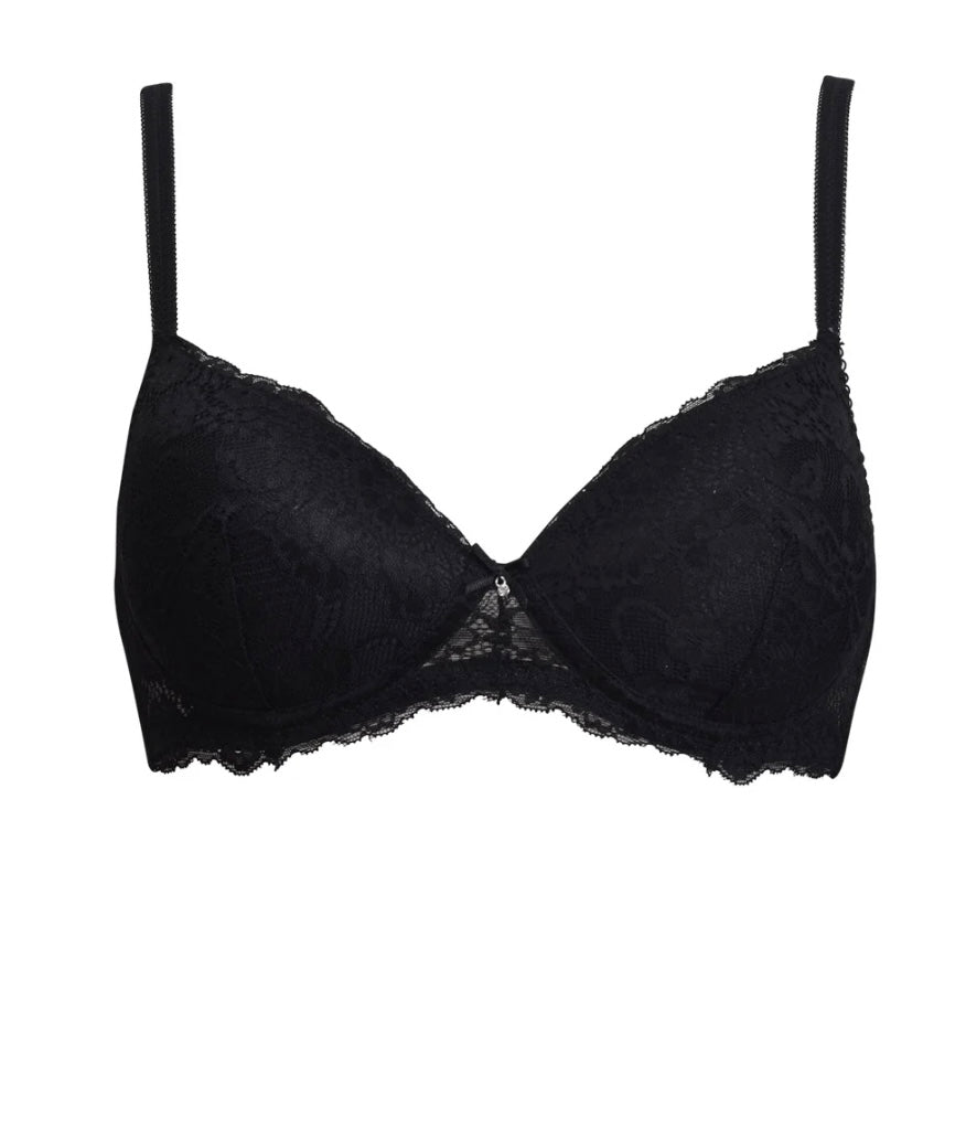 2676 SIELEI : Reggiseno con coppe graduate senza ferretto, realizzato in raffinata balza di pizzo con motivo floreale. Torace e centroseno in laize di pizzo con spalline regolabili. Dettaglio a centroseno di fiocchetto in raso con gioiello e punto luce.