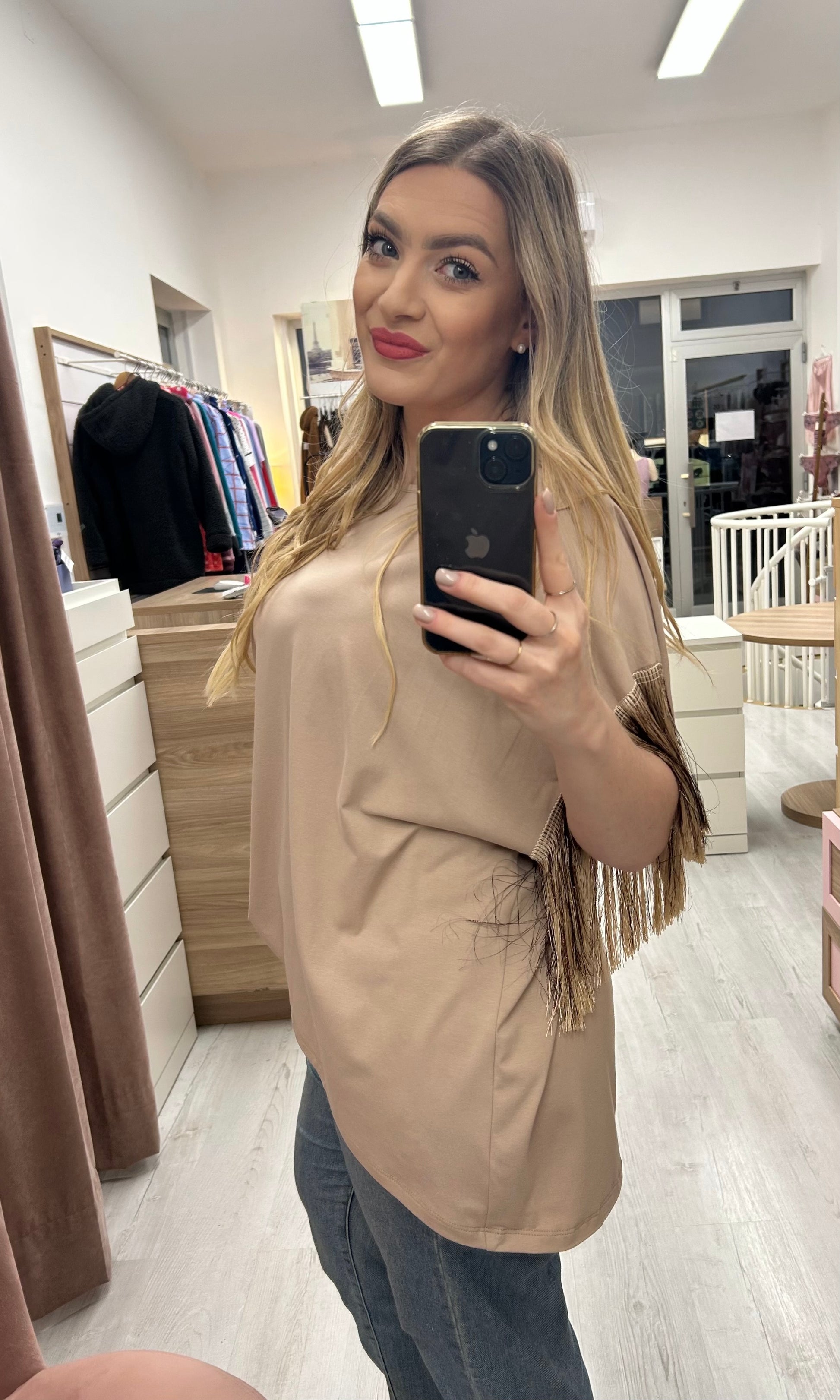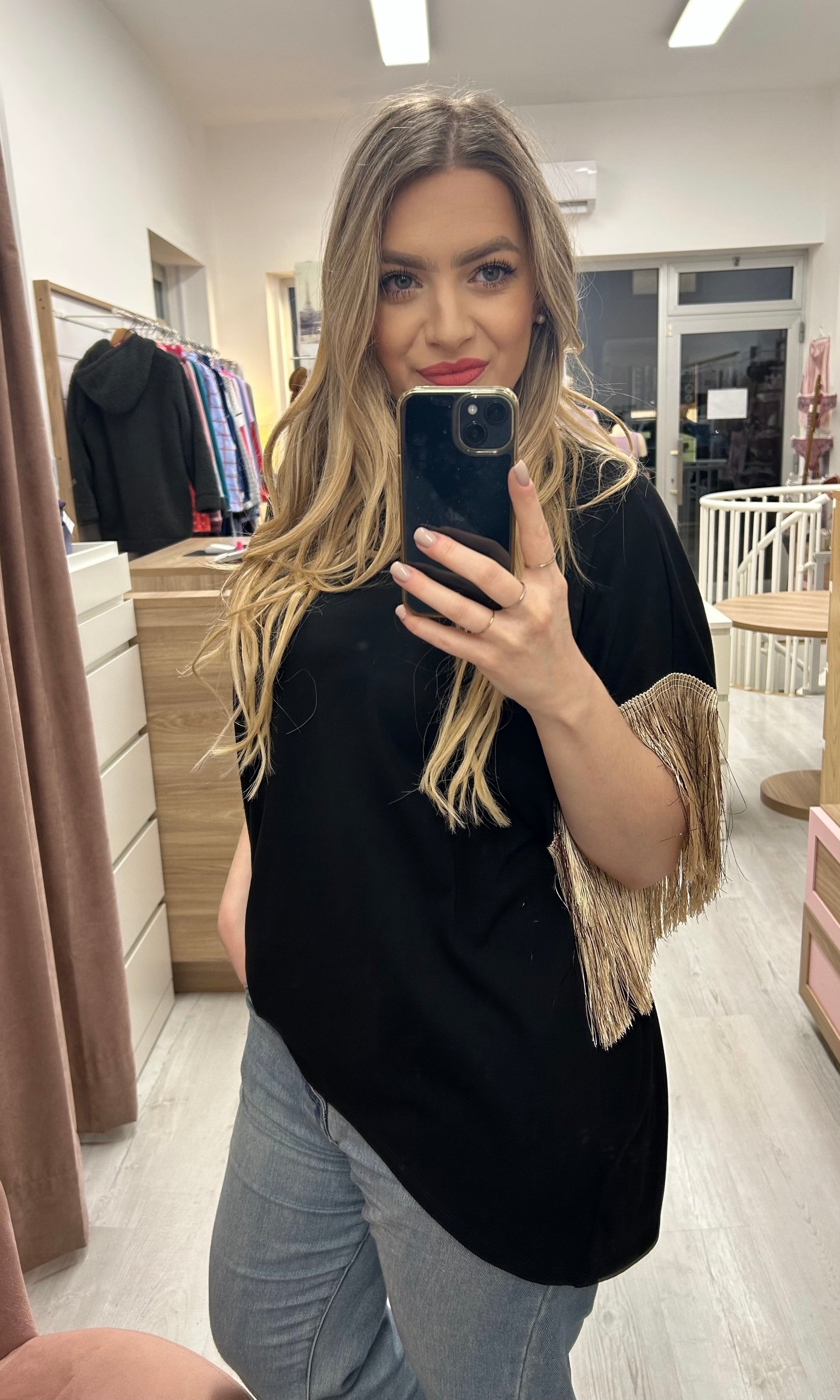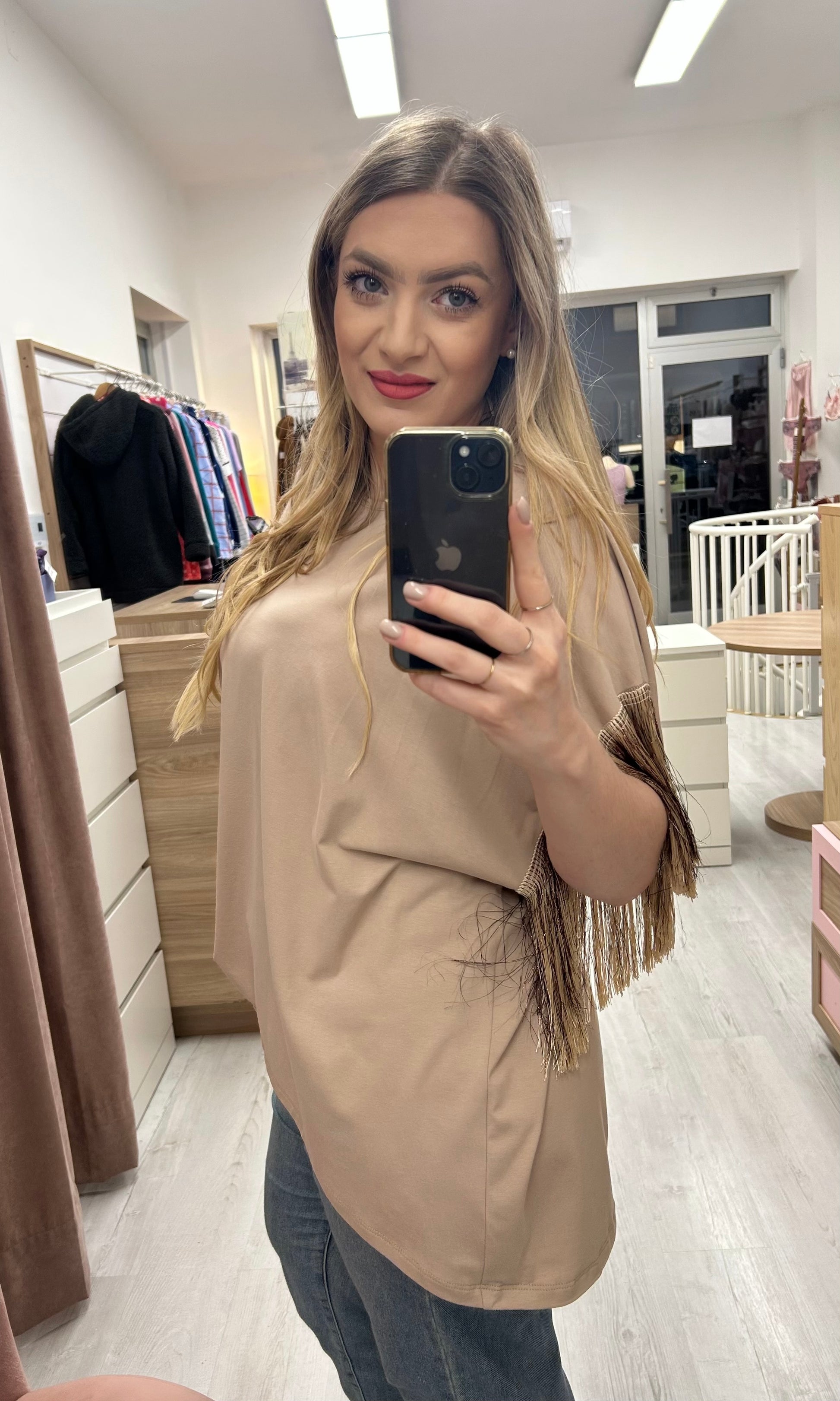 STS7328 SUSYSTAR : La T-Shirt SUSYSTAR CURVY presenta un design over con frangia dorata, lungo e con spalla scesa, specificamente realizzata per esaltare la silhouette curvy. La tinta unita offre versatilità, rendendola adatta a molteplici abbinamenti, mentre la lunghezza e la vestibilità garantiscono comfort e stile. Disponibile in due varianti colore : NERO e SABBIA taglia 1CURVY.