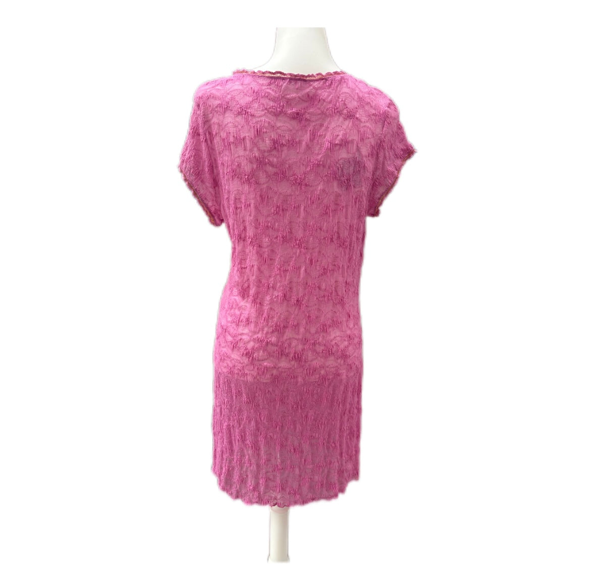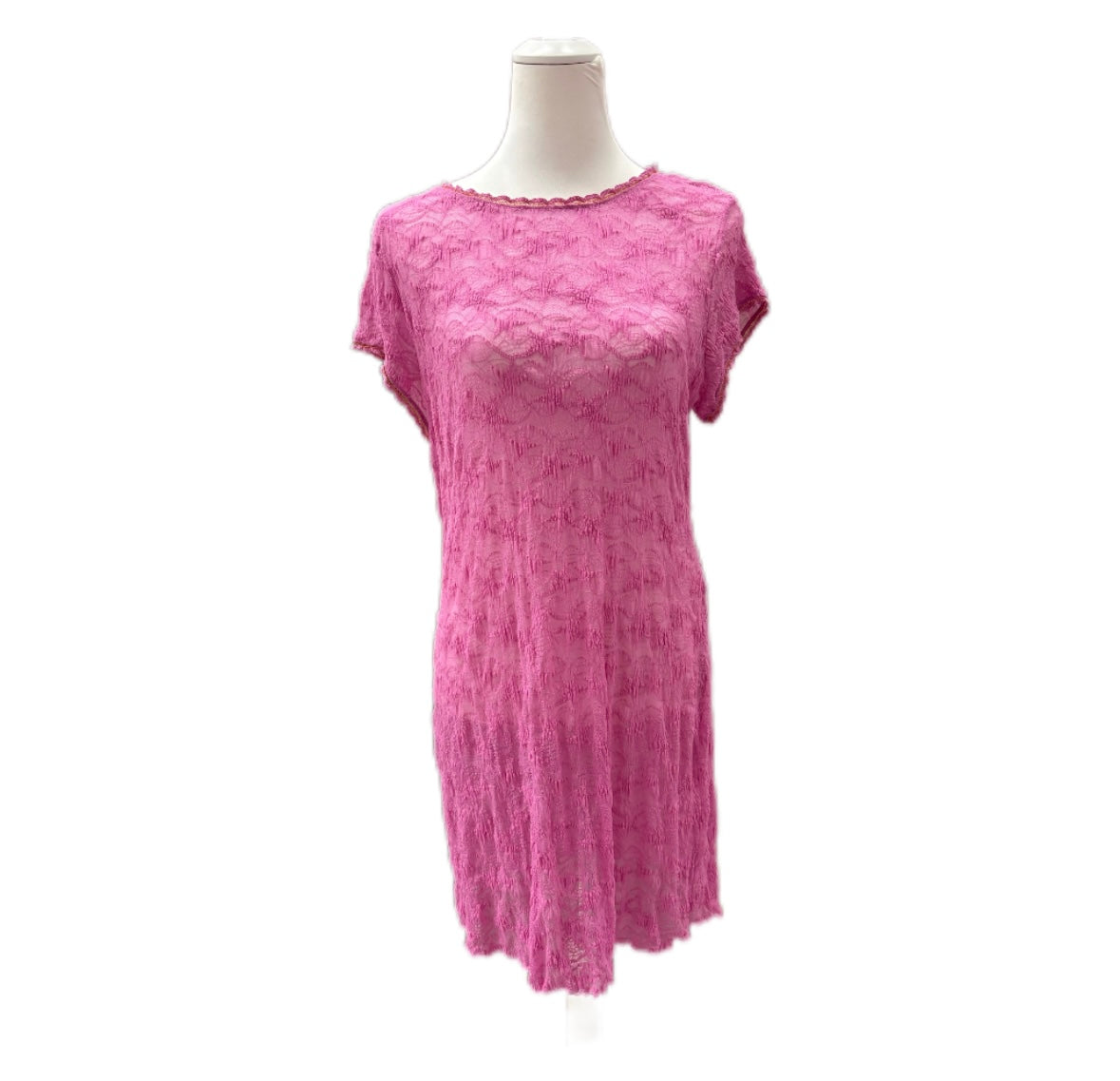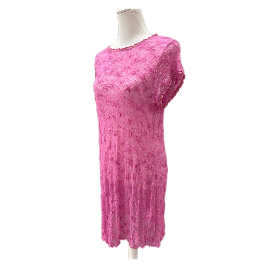 S3RCB81 VERDISSIMA : Abito girocollo, manica corta, lunghezza al ginocchio. Lavorazione allover in pizzo, tinto filo, tinta unita. Rifinitura laminata dorata su bordatura scollo e giro manica. Disponibile in variante colore unica : 010FUXIA.