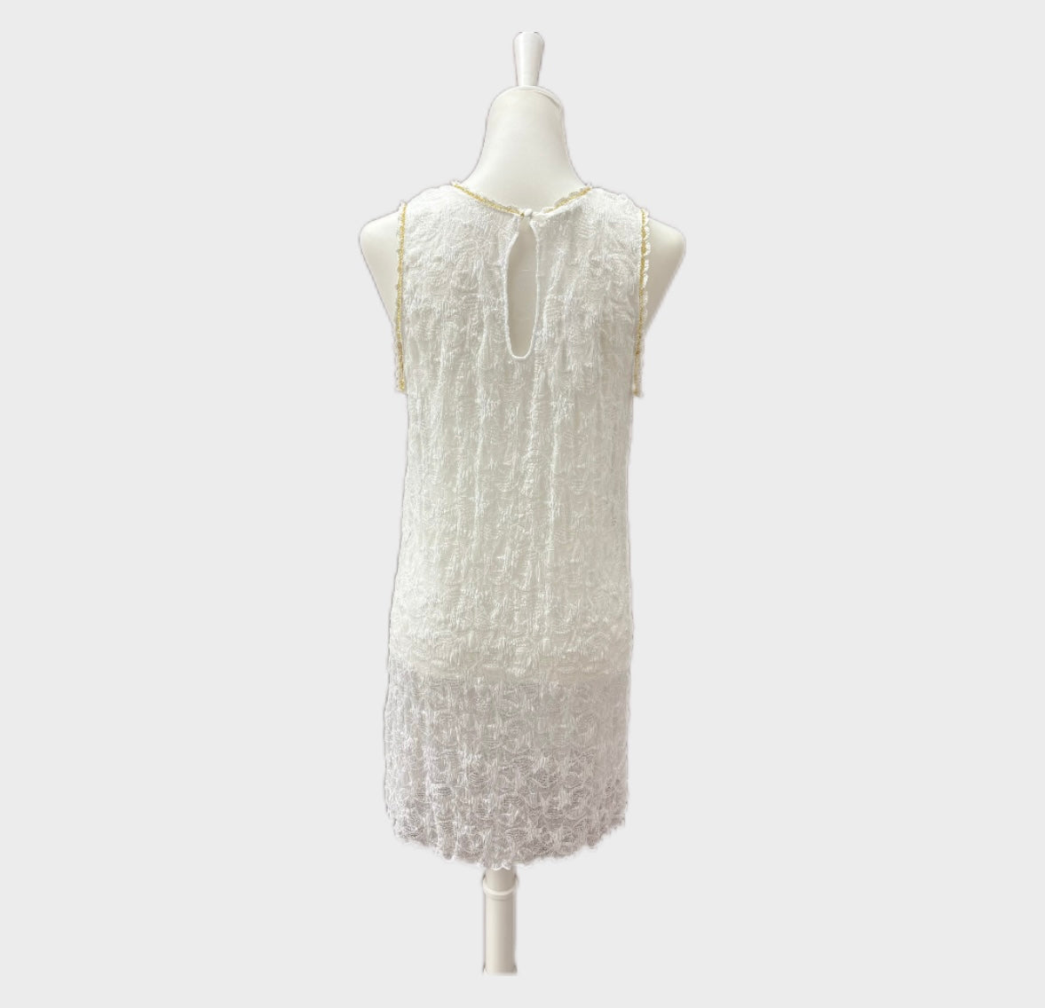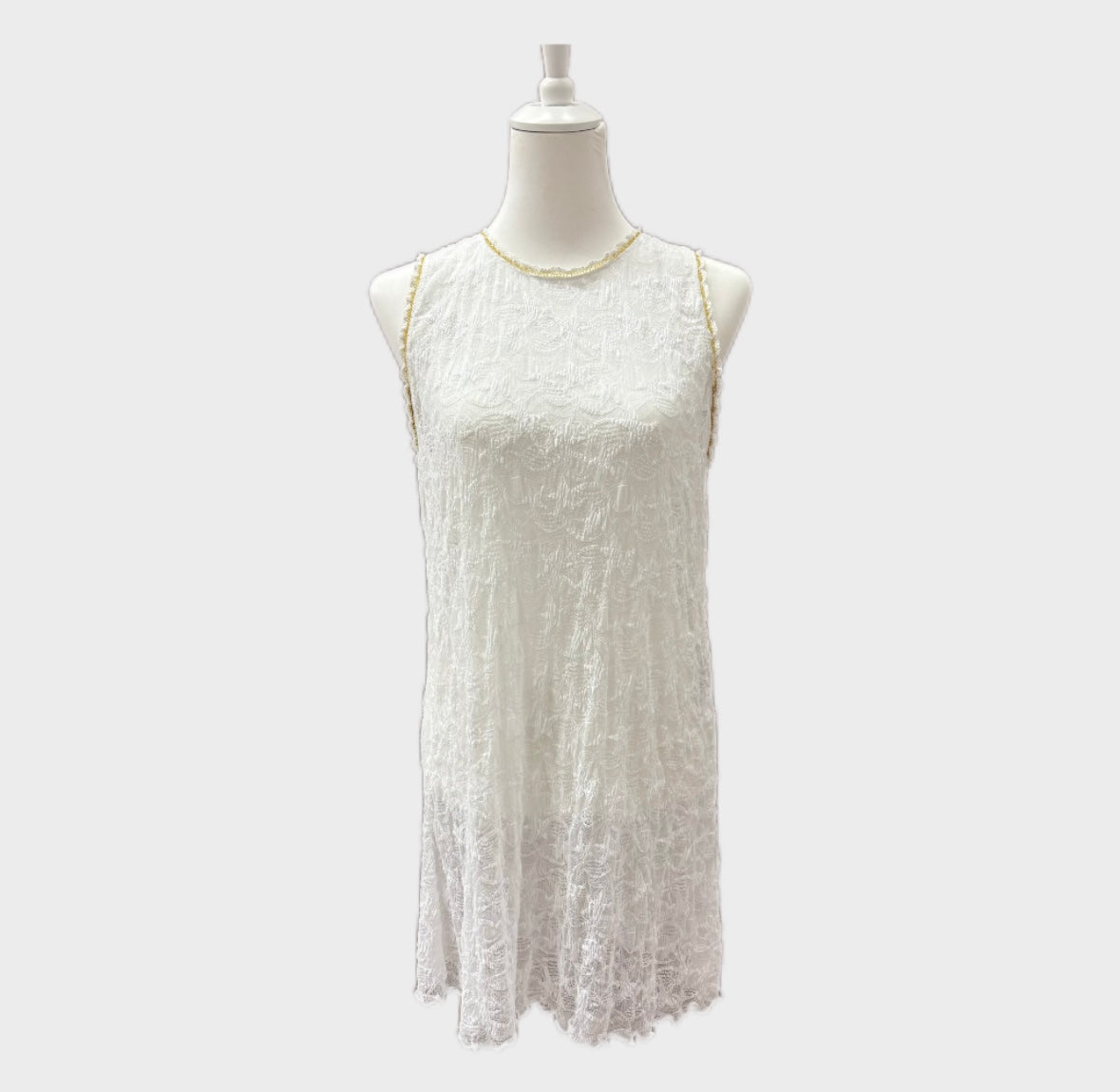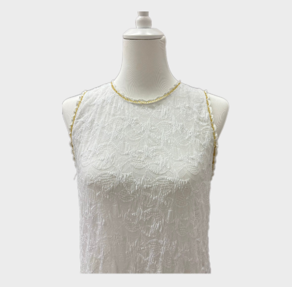 S3RCB82 VERDISSIMA : Abito girocollo, senza manica, spalla larga, lunghezza al ginocchio. Lavorazione allover in pizzo, tinto filo, tinta unita. Rifinitura laminata dorata su bordatura scollo e giro manica. Apertura su centro dietro scollo con bottone, forma goccia serafino. Disponibile in 2 varianti colore : 01BIANCO e 099NERO.
