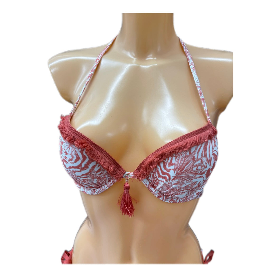 S3SMN26 VERDISSIMA : Bikini Push up con ferretto in coppa B e slip modello tanga con laccetti regolabili e accessorio nappa finale. Vestibilita’ slim. Stampa allover fantasia floreale stilizzata, con passamaneria a contrasto in tinta unita, tinto filo su bordo coppa. Lacci regolabili con doppia possibilità di allacciatura manuale : stile triangolo o reggiseno. Accessorio finale in nappa su centro davanti. Stampa floreale allover : fantasia stilizzata a due colori. Disponibile in due varianti colore: 099BIANCO/NERO e 0183BIANCO/RUGGINE. Limited edition.