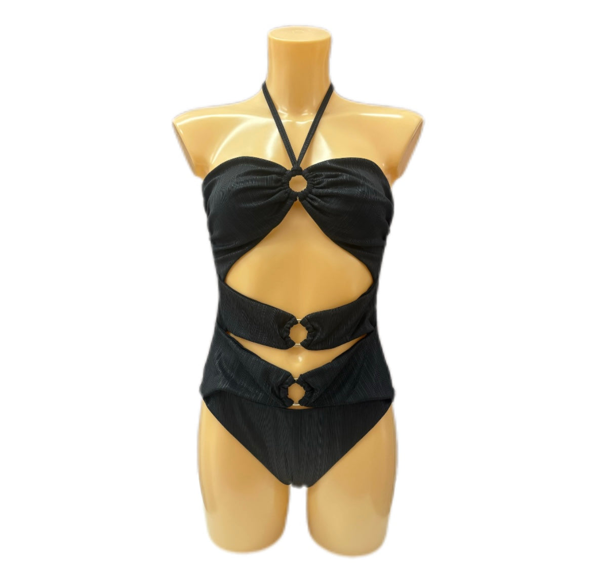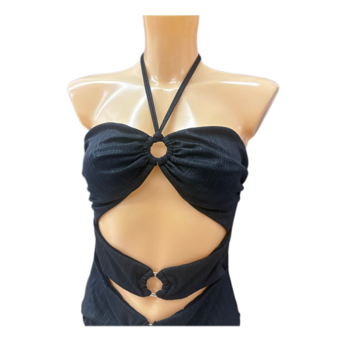 S3SPS50 VERDISSIMA : Intero modello fascia con lacci regolabili su centro dietro collo. Anello centrale su décolleté. Aperture su centro davanti unite da accessorio circolare in galvanica dorata. Vestibilita’ slim. Effetto cangiante : shantung satinato. Disponibile variante colore unica : 099NERO CAPO CIVETTA.