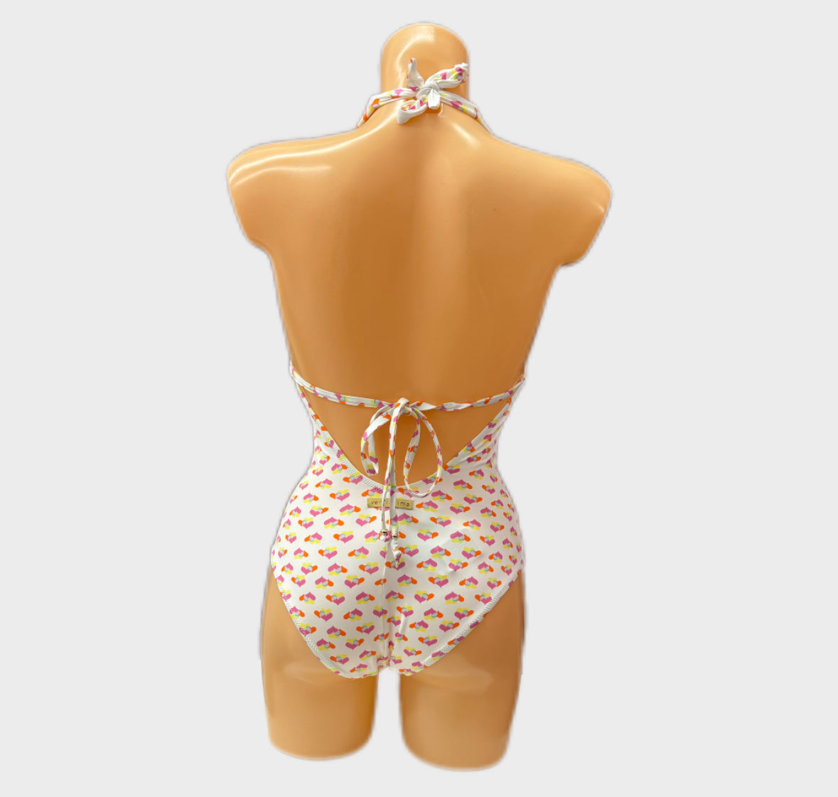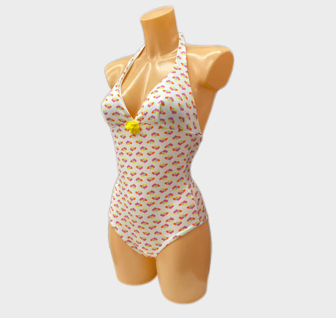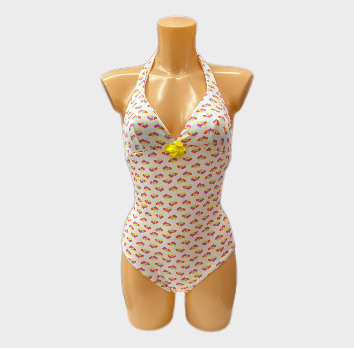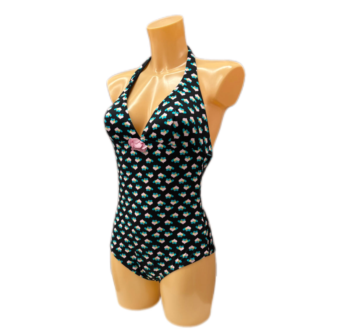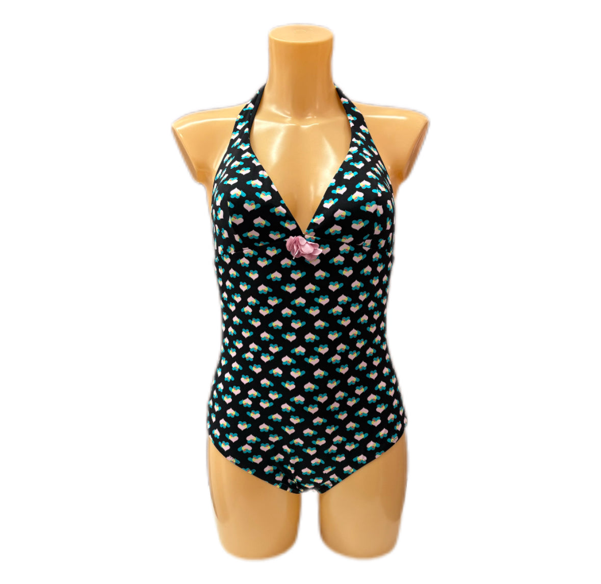 HS51 VERDISSIMA : Intero con coppa estraibile e allacciatura manuale su centro dietro torace e scollo. Stampa allover cuoricini a due colori su fondo tinta unita. Applicazione accessorio floreale a contrasto su centro seno. Disponibile in due varianti colore: 099NERO e 01BIANCO.